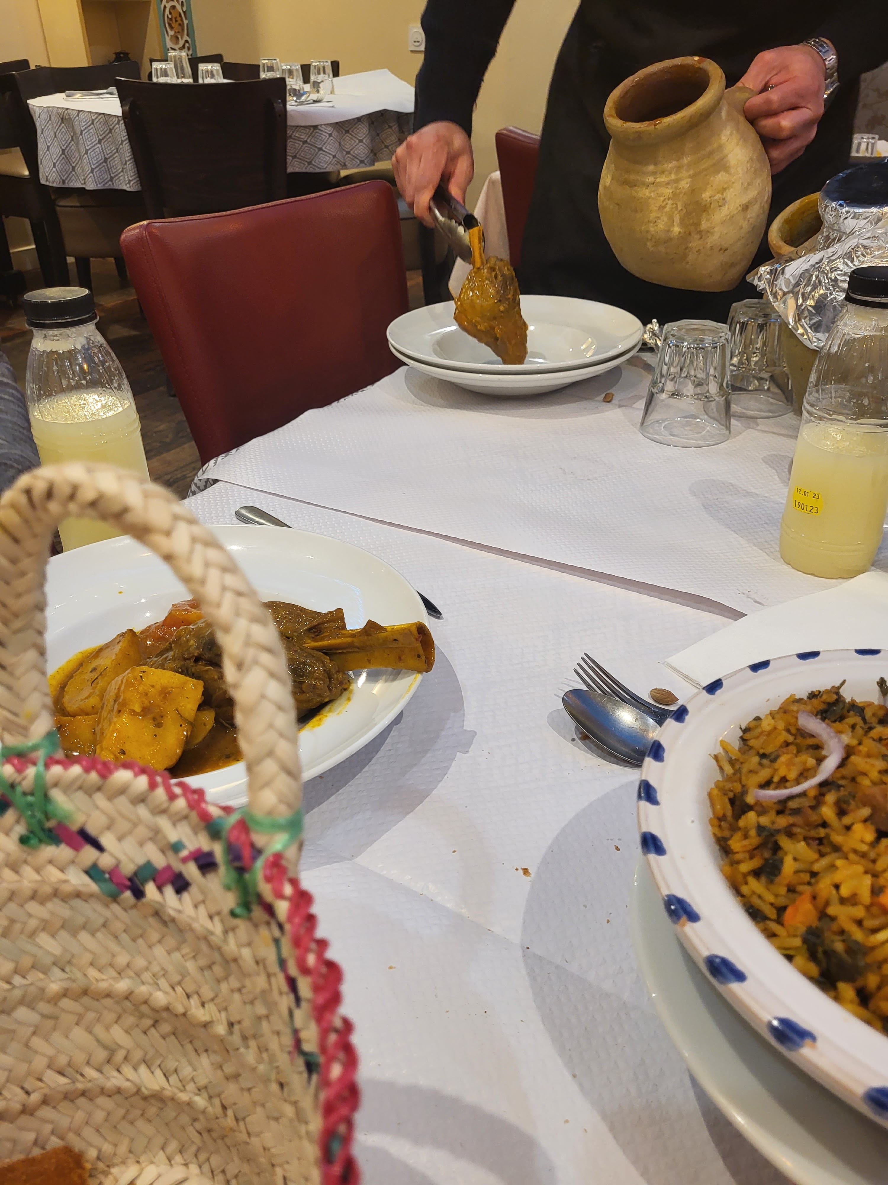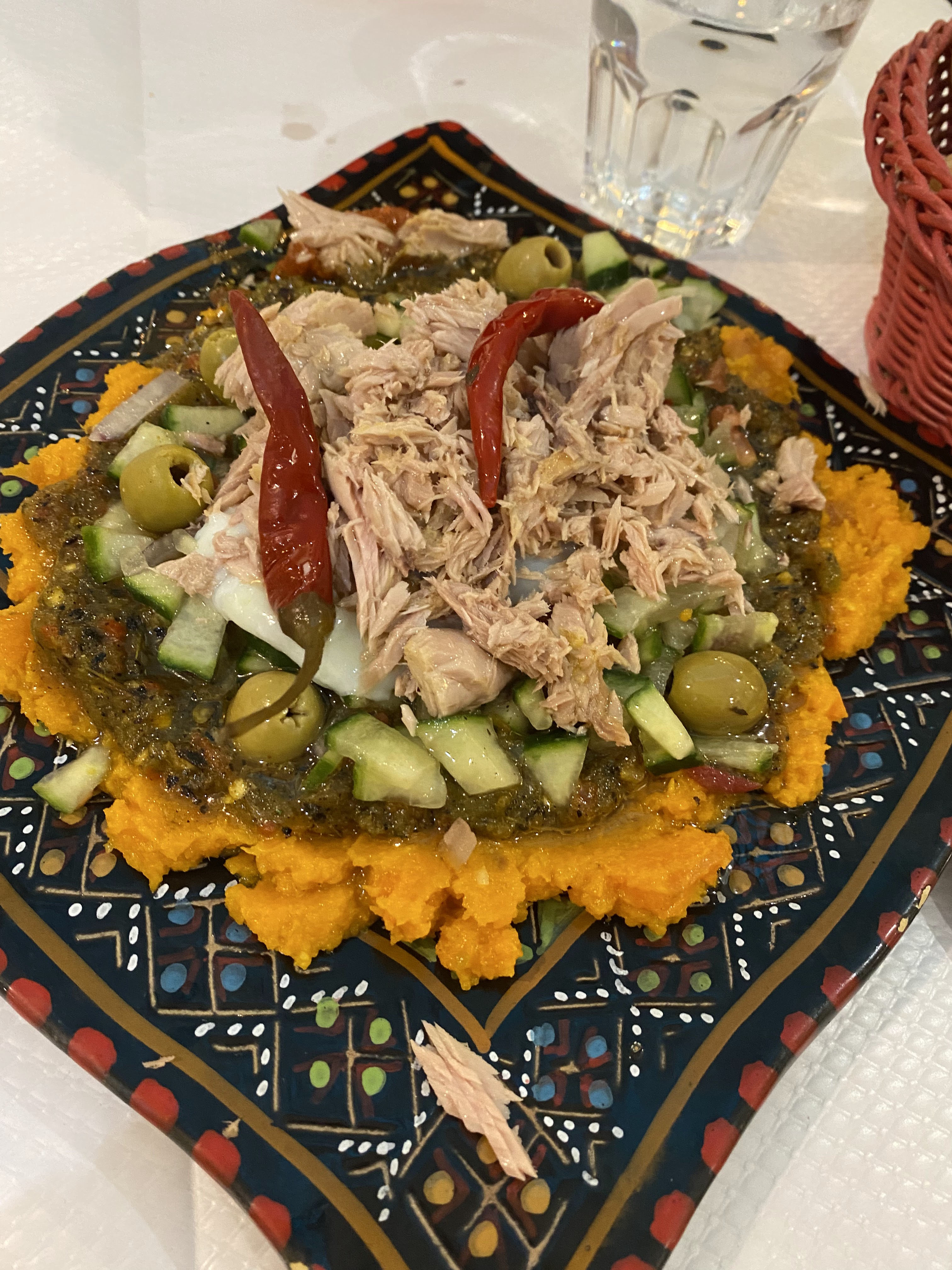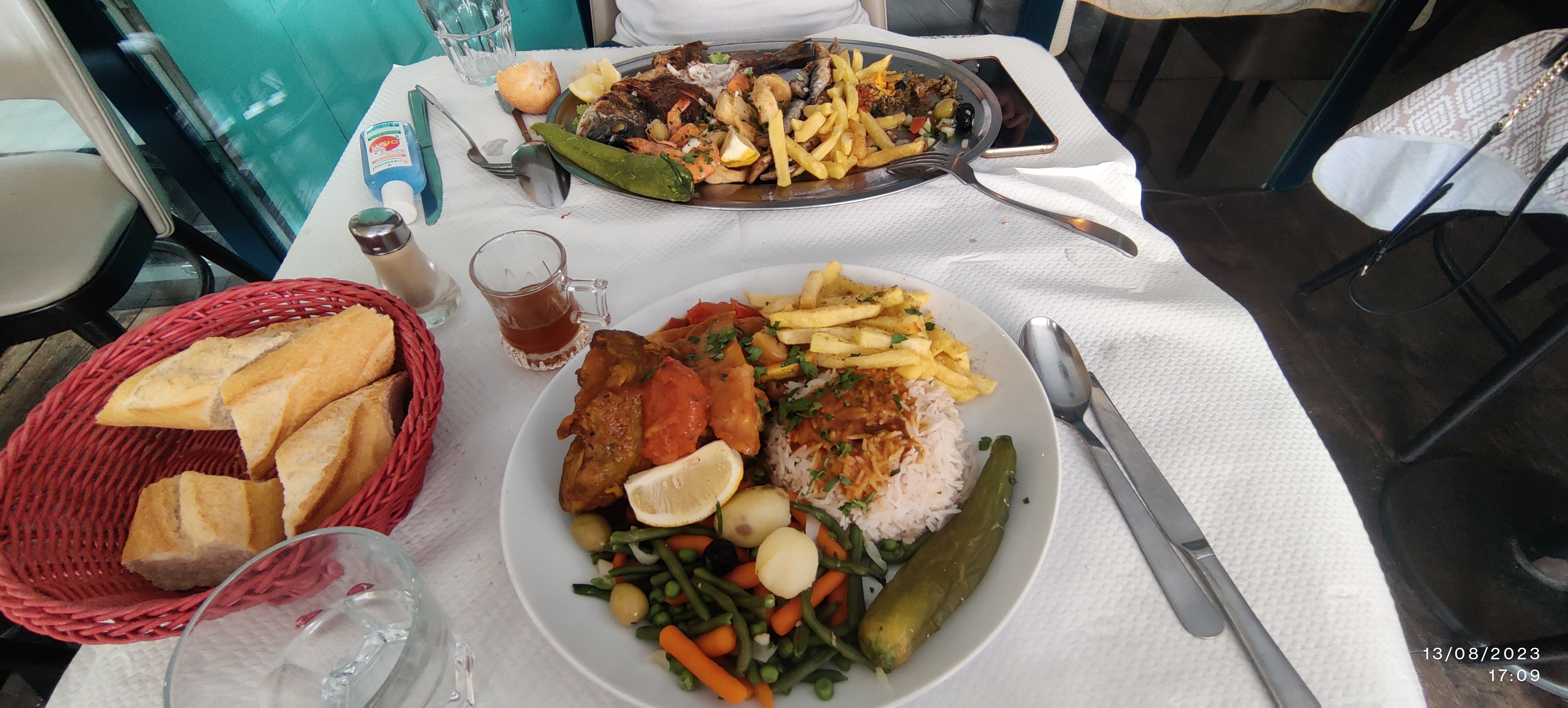 C’était un régal: de l’entrée au dessert tout était authentique et plein de saveurs. Un seul bémol: le riz djerbien était un peu sec avec quelques morceaux de viande. Le thé à la menthe et au jasmin nous a été offert. J’ai oublié de prendre en photo assida zgougou mais elle était succulente ! Il ne faut pas oublier le service et l’accueil: agréable et chaleureux, on se sent comme à la maison !