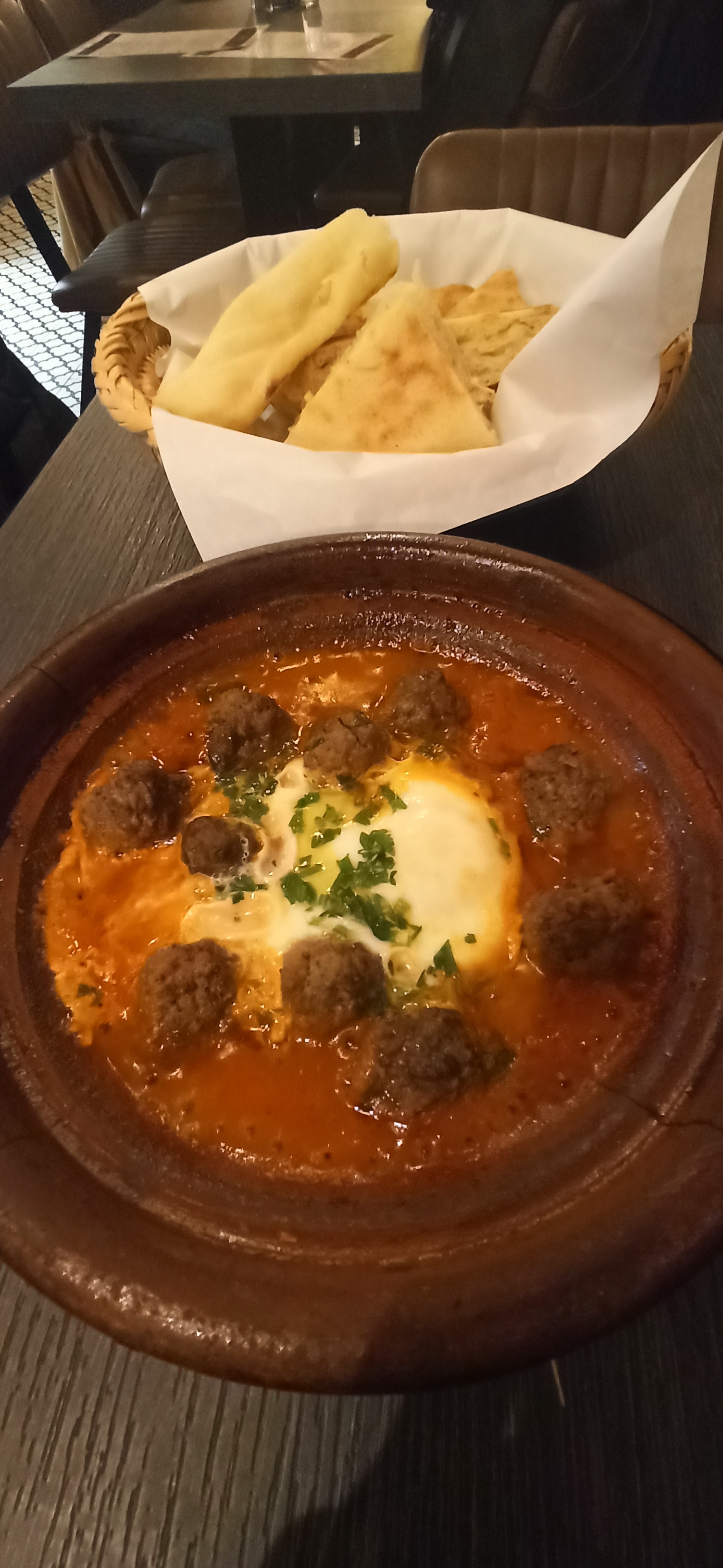 Resto très sympa, la salle n'est pas très grande, mais l'ambiance est chaleureuse, l'équipe souriante nous a très bien accueilli. Les portions sont très généreuses, le msemen végétarien et le tajine poulet-olive sont délicieux, on reviendra goûter au reste 👌