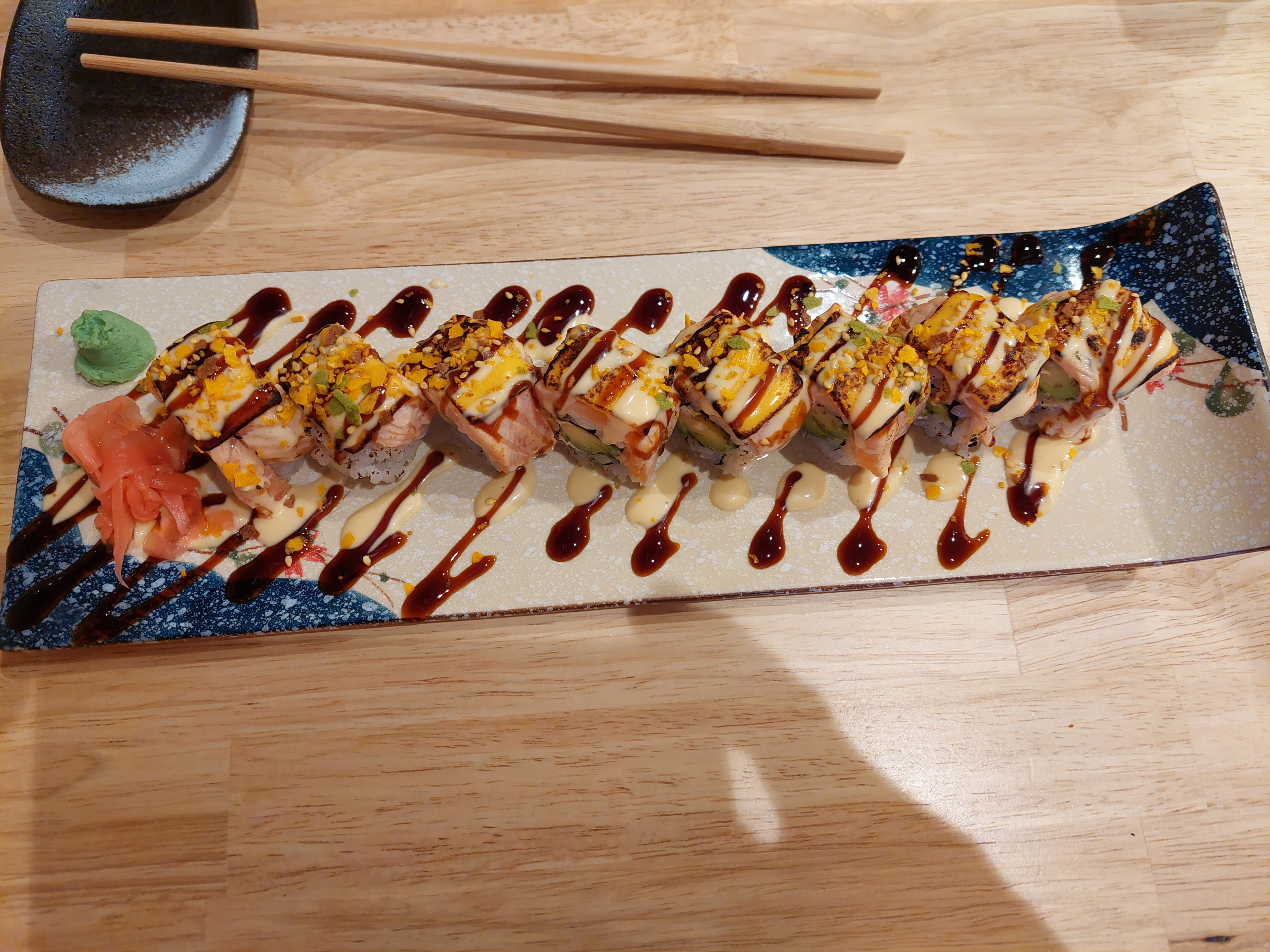 Pourquoi le riz vinaigré était chaud ? L’ Espèce de gros gros maki plein de sauce sucrée coriandre et saumon en miette un peu moyen. Le reste ça va.