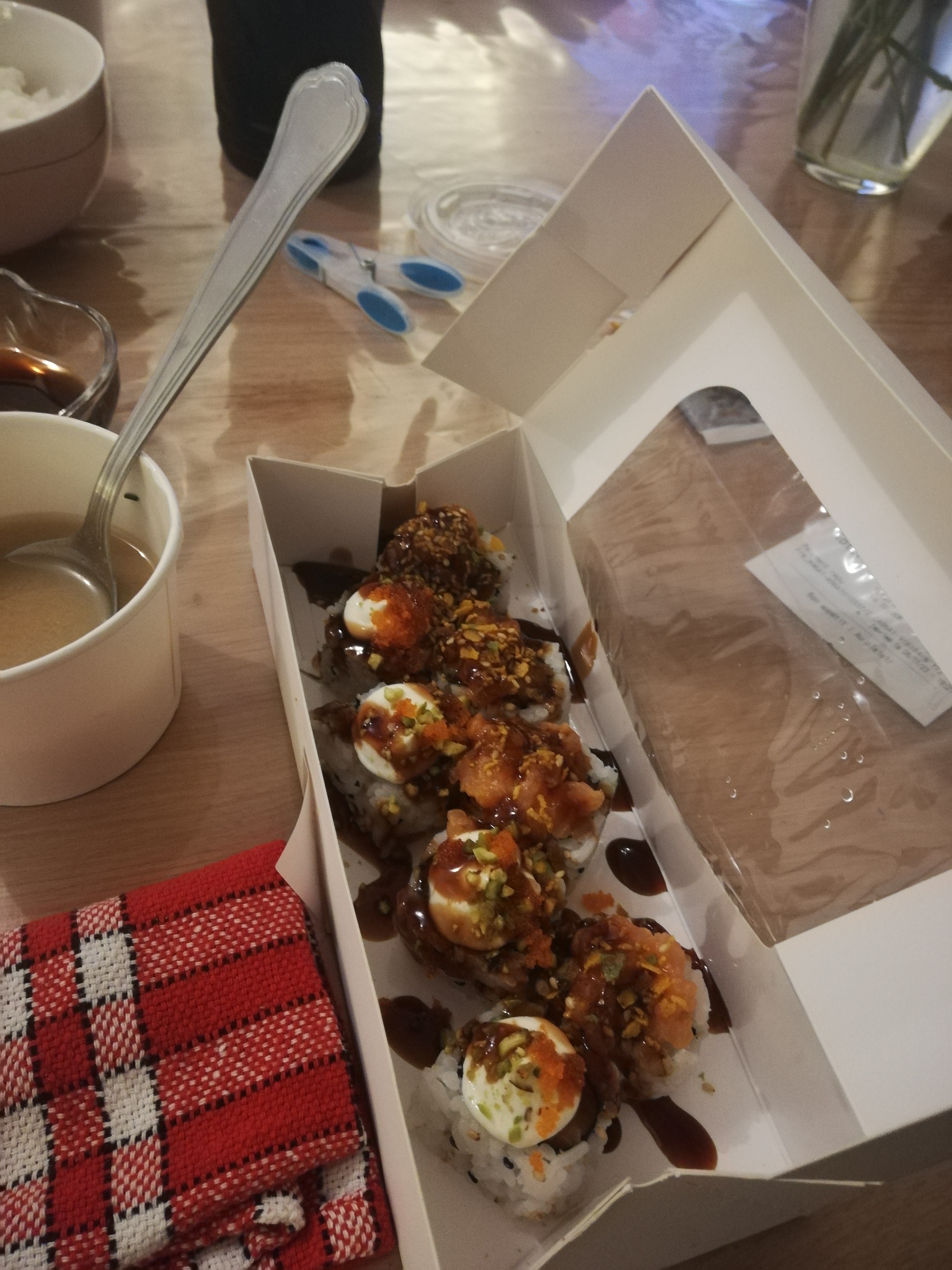 Excellent, je reviendrai ! Les sushis classiques sont très bons et les créations sont originales et très réussies. Le service est impeccable, la commande était à l'heure et le personnel sympathique. Attention par contre l'emballage des soupes miso fuit à cause des petits trous sur le dessus.