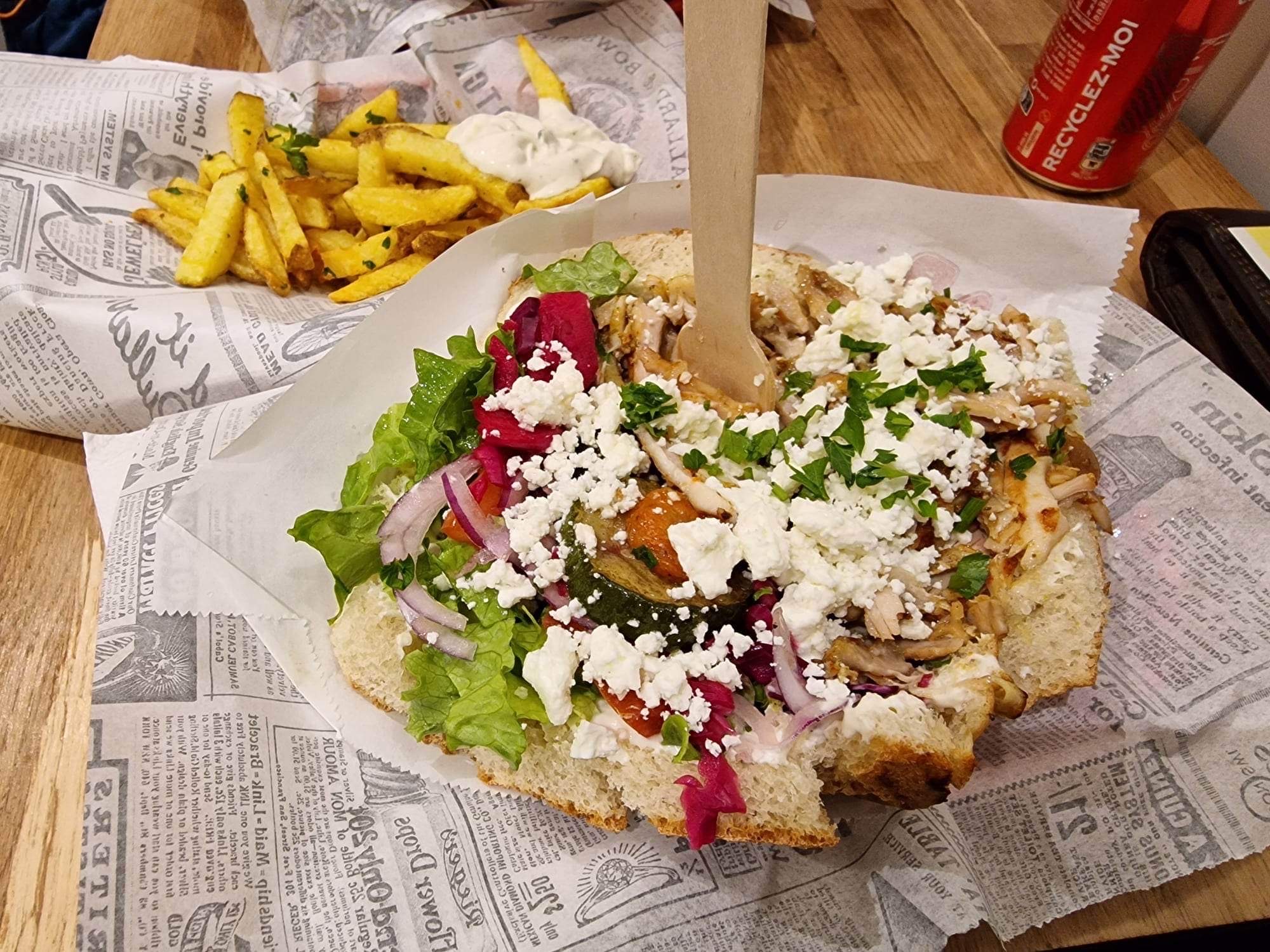 C'était vraiment savoureux. Du pain fait maison, des légumes grillés et une sauce incroyablement délicieuse et des frites maison. L'un des meilleurs kebabs que j'ai jamais mangé. Absolument génial. Nous reviendrons certainement lorsque nous serons à Paris. Le prix est également tout à fait correct. Personnel super sympa et sympathique. 👍