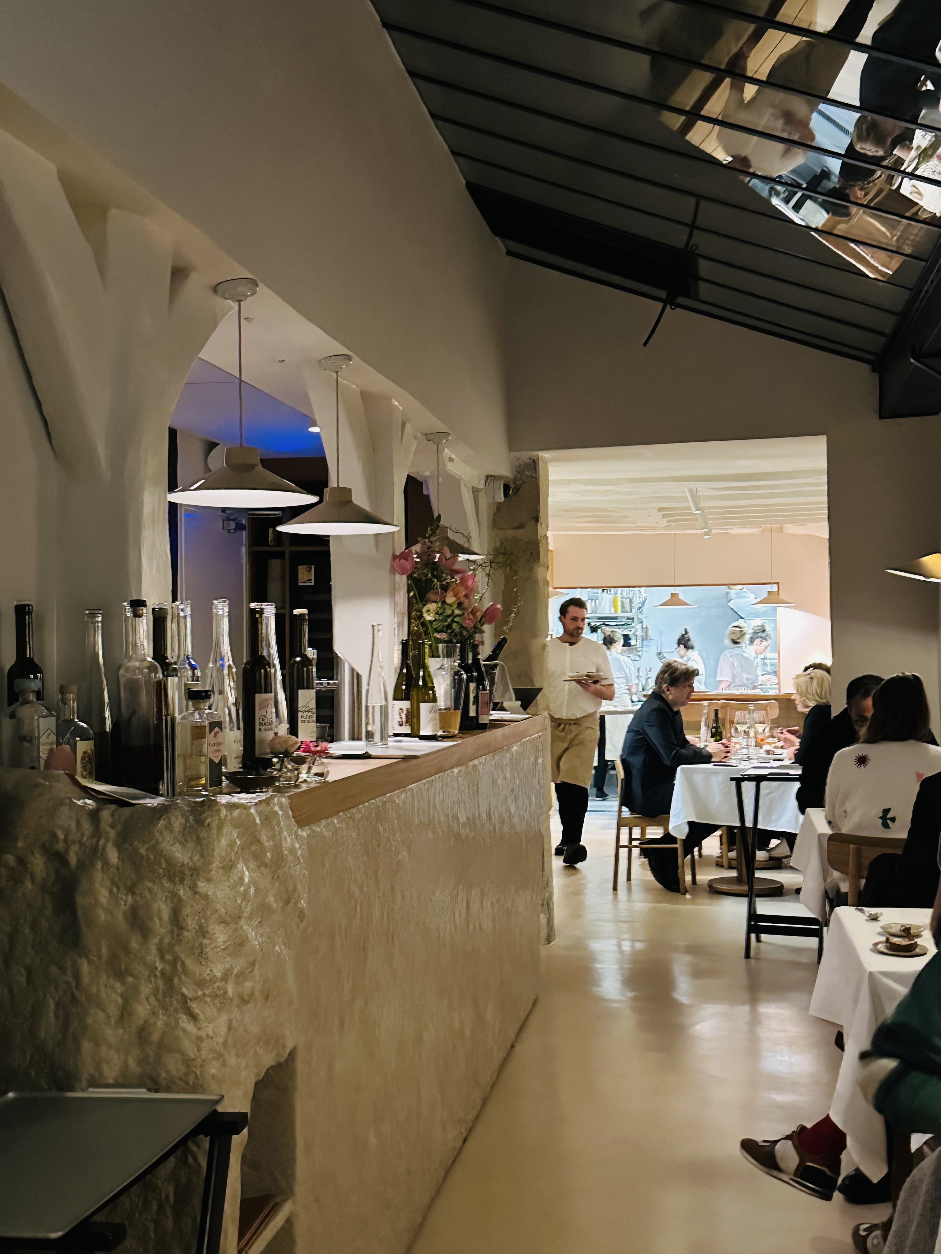 Les points positifs : -un lieu agréable, lumineux, avec des tables qui ne sont pas entassées les unes contre les autres -la grande gentillesse de la serveuse aux grandes lunettes qui s'est occupée de nous dans un 2° temps, et aussi de la sommelière qui défend avec passion ses goûts, même si je ne partage pas ceux ci. - un des plats (sur 7 ?), une St Jacques quasi crue, accompagnée d'un condiment assez fort qui en faisait superbement ressortir le goût. Les points négatifs : -le baratin bobo woke qui vous accueille à l'entrée -la stagiaire danoise qui s'est au départ occupé de nous, glaciale et parlant à peine français -la plupart des plats, que j'ai trouvés remarquablement insipides ( oignon doux, à l'oignon avec de l'oignon, céleri braisé avec du céleri en purée et du céleri cru, etc...) -l'addition : plus de 150 € par personne. -les troubles intestinaux qui ont suivi toute la nuit... Bref, au bout du compte, une mauvaise expérience - et rien à voir avec le délire médiatique que j'ai pu lire sur ce restaurant et sa cheffe.