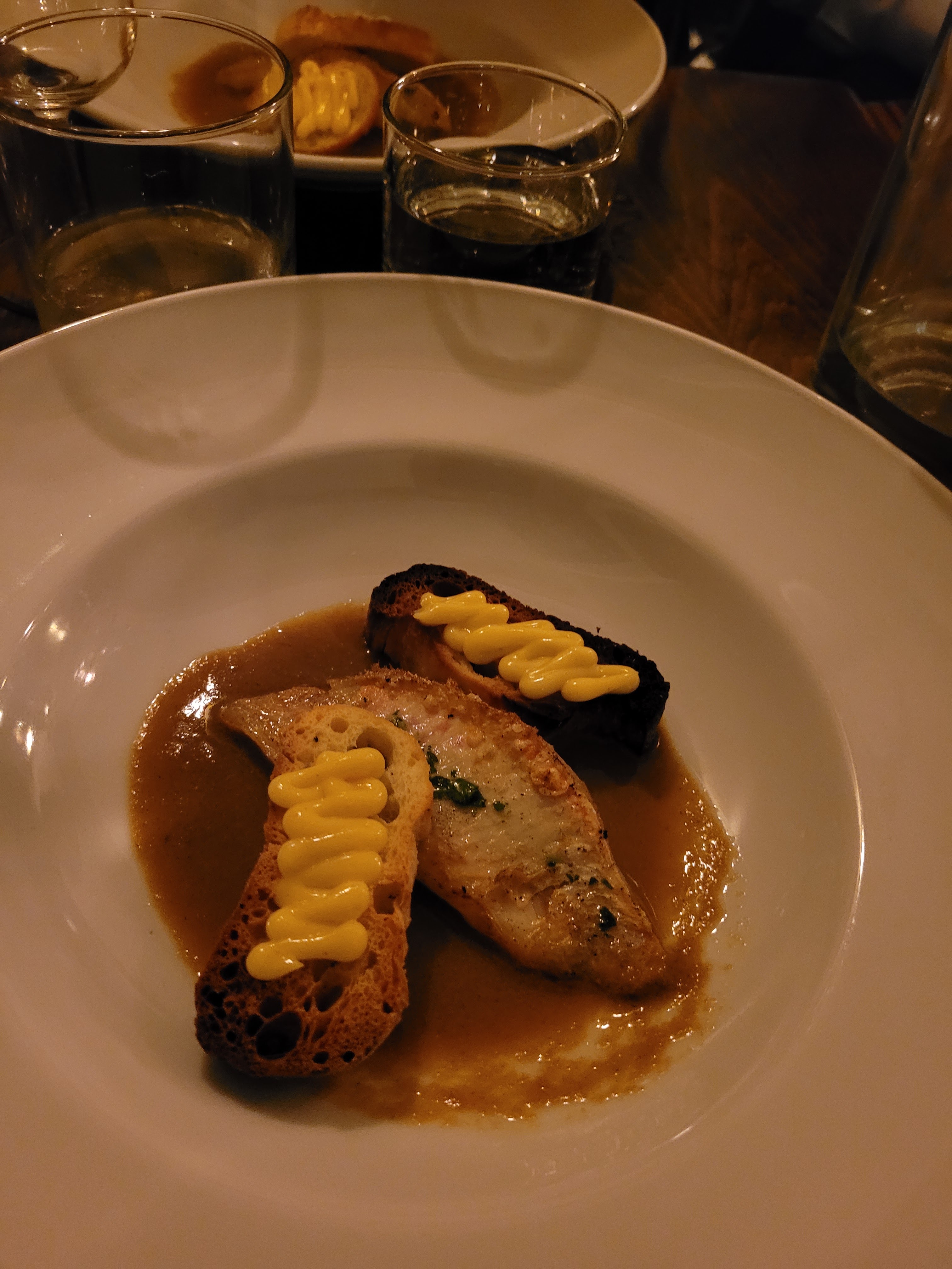 J'ai presque raté une cuisine aussi merveilleuse. Le problème avec ce restaurant, c'est que : on peut facilement passer devant sans le remarquer car il n'a pas le décor le plus attrayant. Il y a une petite terrasse sur le trottoir mais l'intérieur semblait un peu ennuyeux. Le menu est court et simple. Nous avons commandé du rougier grillé sur toasts, du filet de poisson avec émulsion de bouillabaisse & risotto et tartare de bœuf. Nous étions l'une des 2 tables à ce moment-là, donc le service était excellent. Le poisson était cuit à la perfection, chaque plat était léger, frais et équilibré. Le seul inconvénient possible était que les portions n'étaient pas énormes. J'étais bien mais si j'avais été affamé avant, j'aurais trouvé que ça manquait. Néanmoins, je recommanderais ce restaurant car c'était un petit bijou. De plus, l'homme là-bas était super sympa.