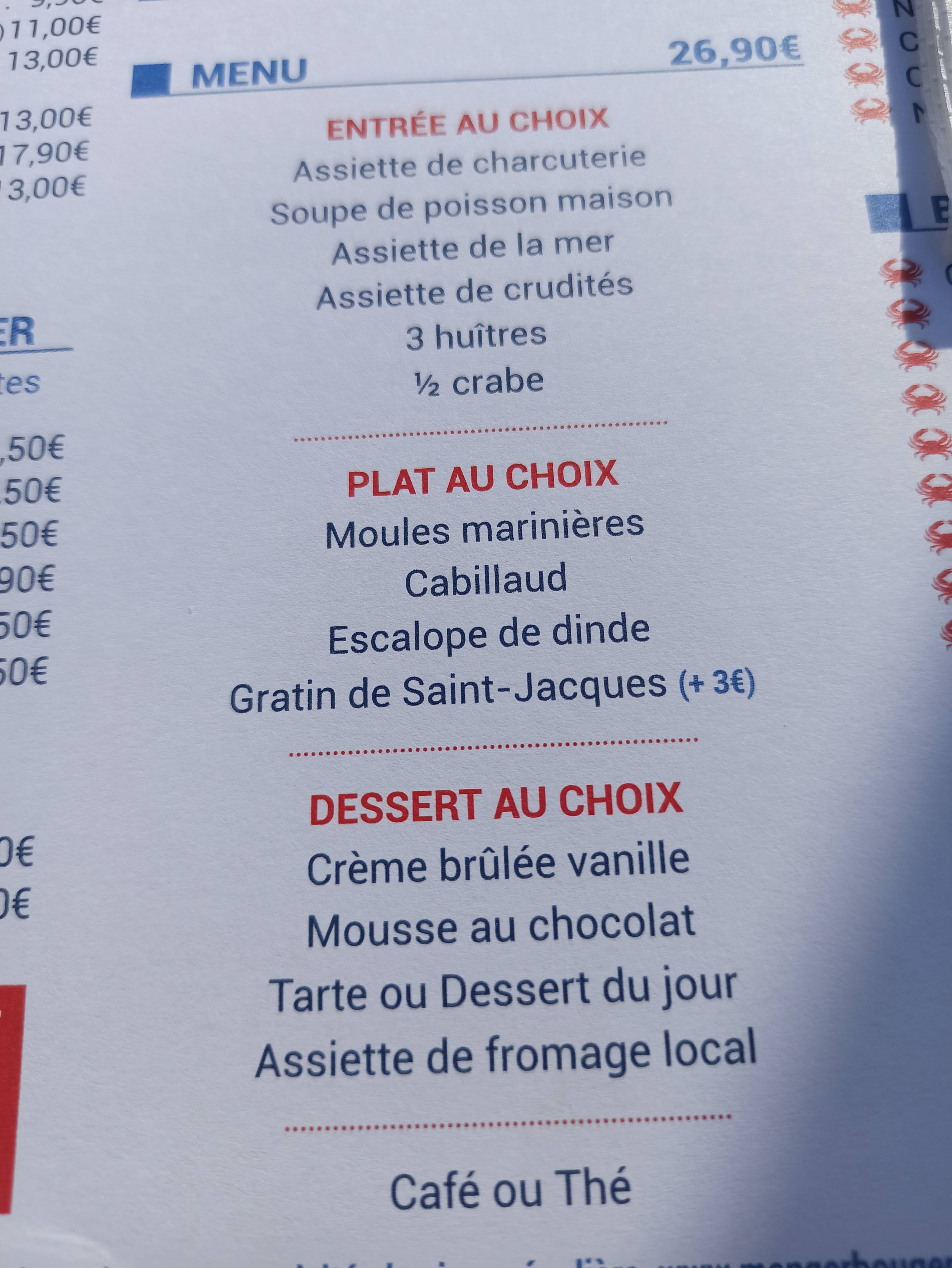 Super ..très bonne soupe de poissons ...crabes..et moules au maroiles et frites..ambiance sympa on s'y sent bien...service cool mais très pro...allez y si vous passez par là...les prix sont corrects...