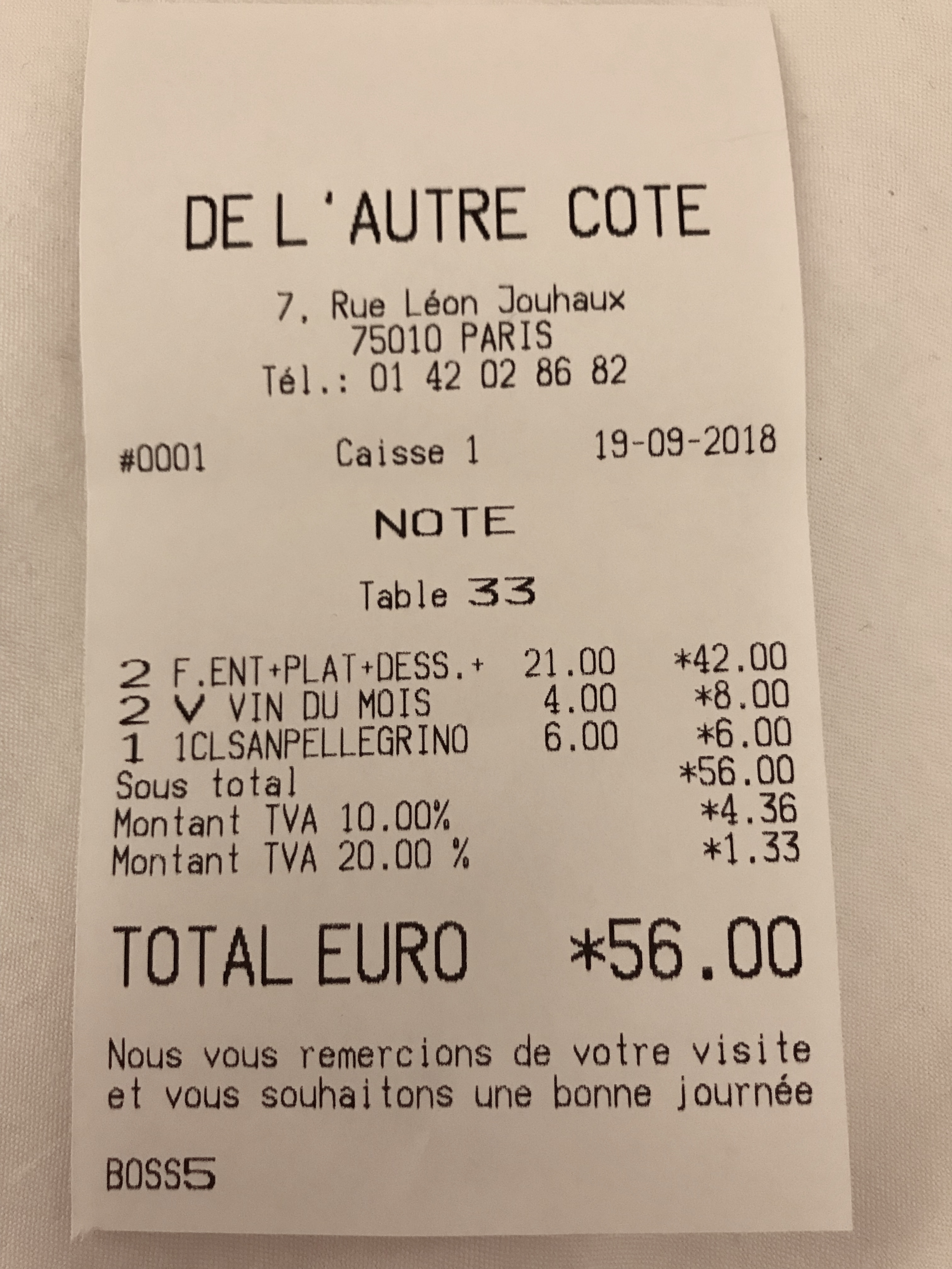 Nous habitons le quartier et avons l'habitude de déjeuner au resto le samedi midi. Nous ne connaissions pas De l'autre côté et, vus les commentaires, nous nous sommes dit : pourquoi pas !. J'ai commandé une côté de boeuf avec frites maison : très bon. Ma compagne a pris un filet de St Pierre : il était dur, trop cuit et froid. Le patron lui a proposé de la dorade. La dorade est arrivée pas assez cuite. Ma compagne a rendu le plat et dit qu'elle ne voulait plus rien. Nous demandons la note: le poisson était facturé. Nous avons appelé le patron et dit que nous étions surprises d'y voir le poisson. Le patron a dit qu'il allait appeler la Police, que nous n'allions pas bien dans notre tête, que c'était la première fois....Nous lui avons dit que étions tout à fait d'accord pour que la Police vienne car nous n'aurions pas de mal à prouver que l'erreur venait d'eux. Finalement, voyant que nous ne cédions pas, ils nous ont fait payer la note sans le poisson. Désagréable expérience, et service client déplorable.