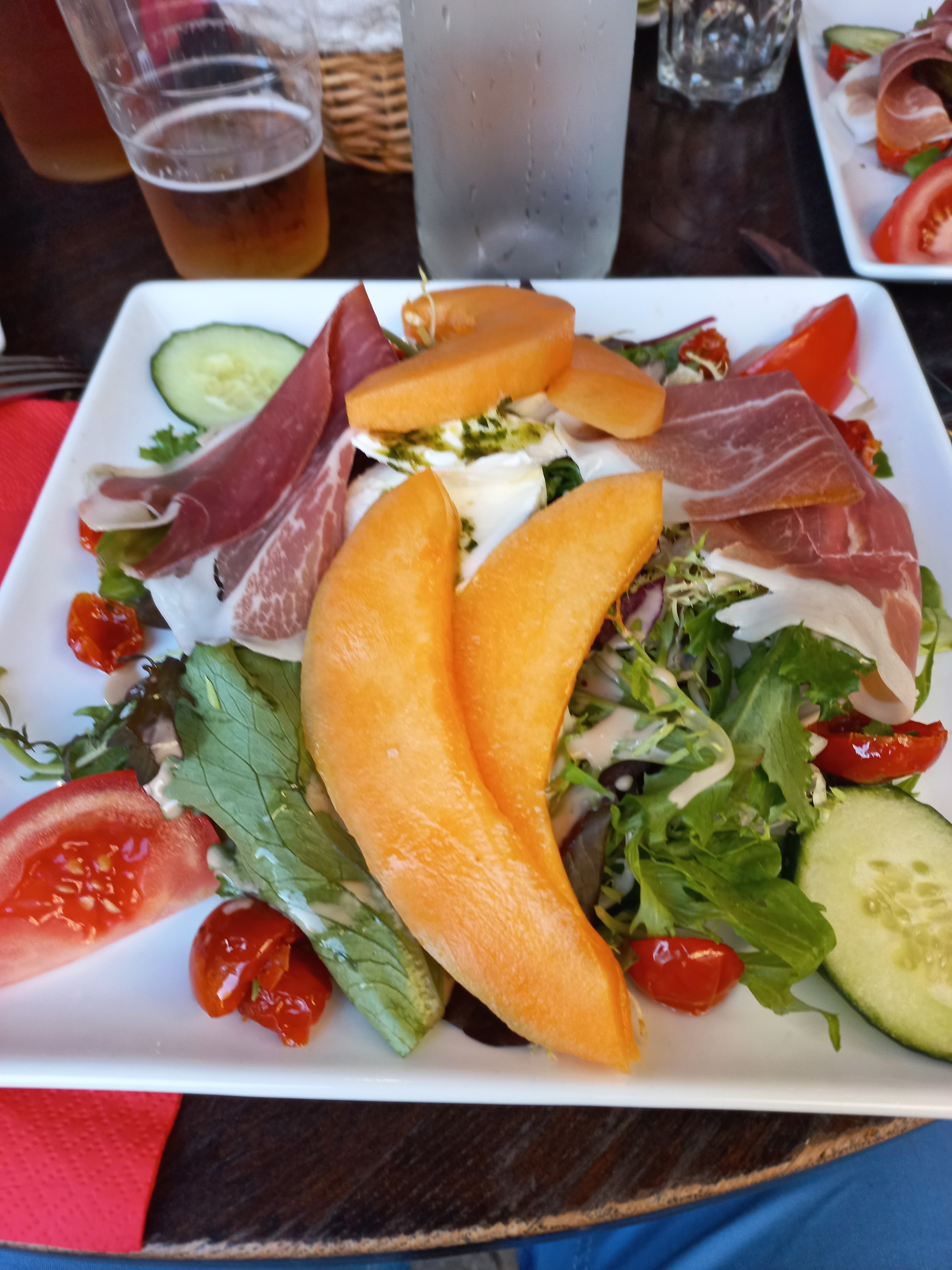 Allez de l autre côté en effet...très déçu J ai pris une salade avec de la mozzarella qui piquait la langue et 4 très très fines tranches de melon, on voyait presque au travers! Oui il y avait de la salade verte ! Passez votre chemin...
