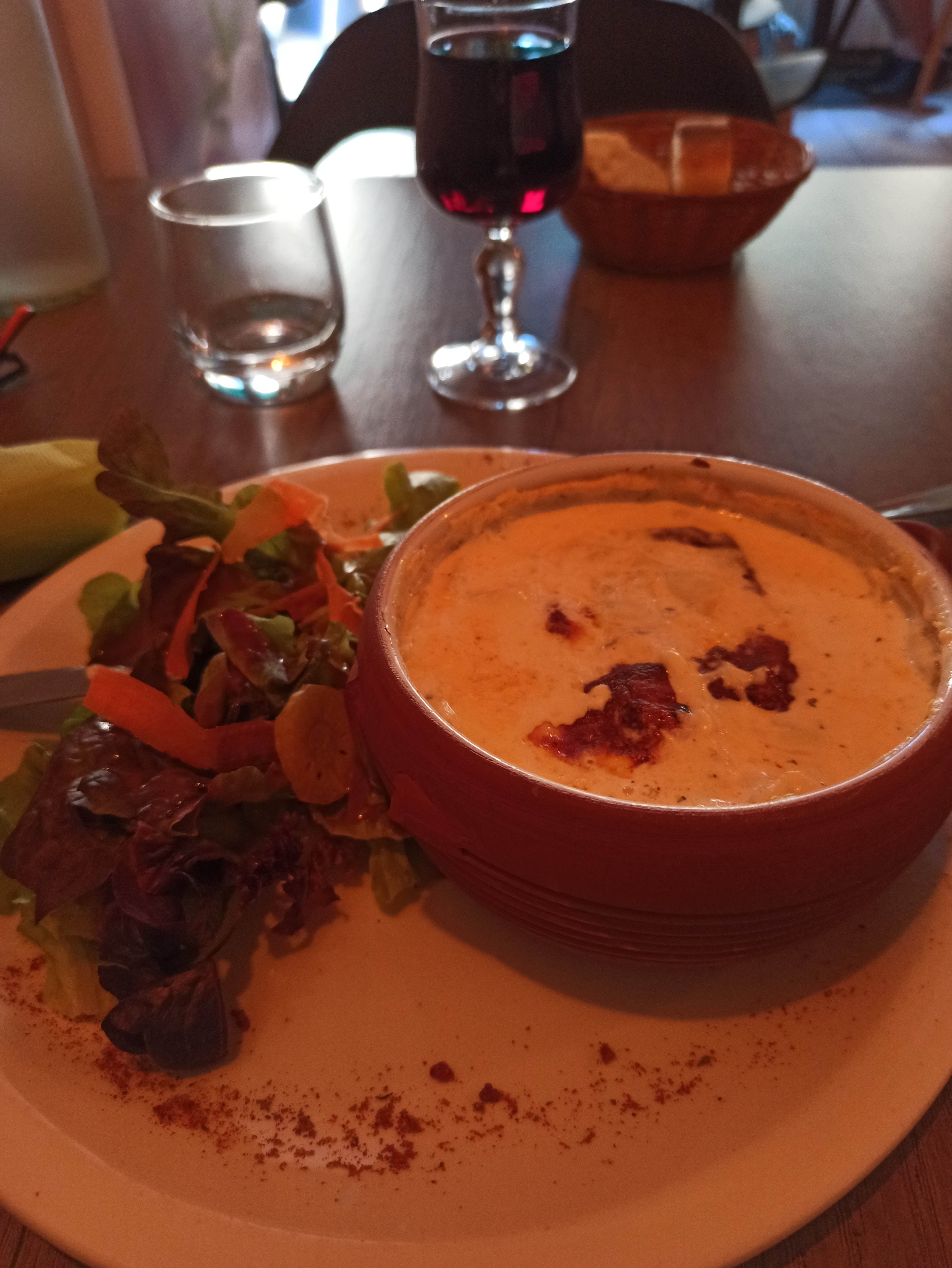 Un dîner qui démarrait plutôt bien sur la carte et le service. Nous avons commandé un Burger et une salade. Le Burger était bon, mais grosse déception sur la salade. La carte annonçait plutôt une salade avec des produits régionaux au final c'est un peu une salade fourre tout !! Du melon, des poivrons crus, des concombre, non annoncés sauf par légumes croquants . Des noix absentes alors qu'elles étaient mentionnées. Et vu le prix je ne recommande pas ... du coup nous avons fait l'impasse sur le dessert.