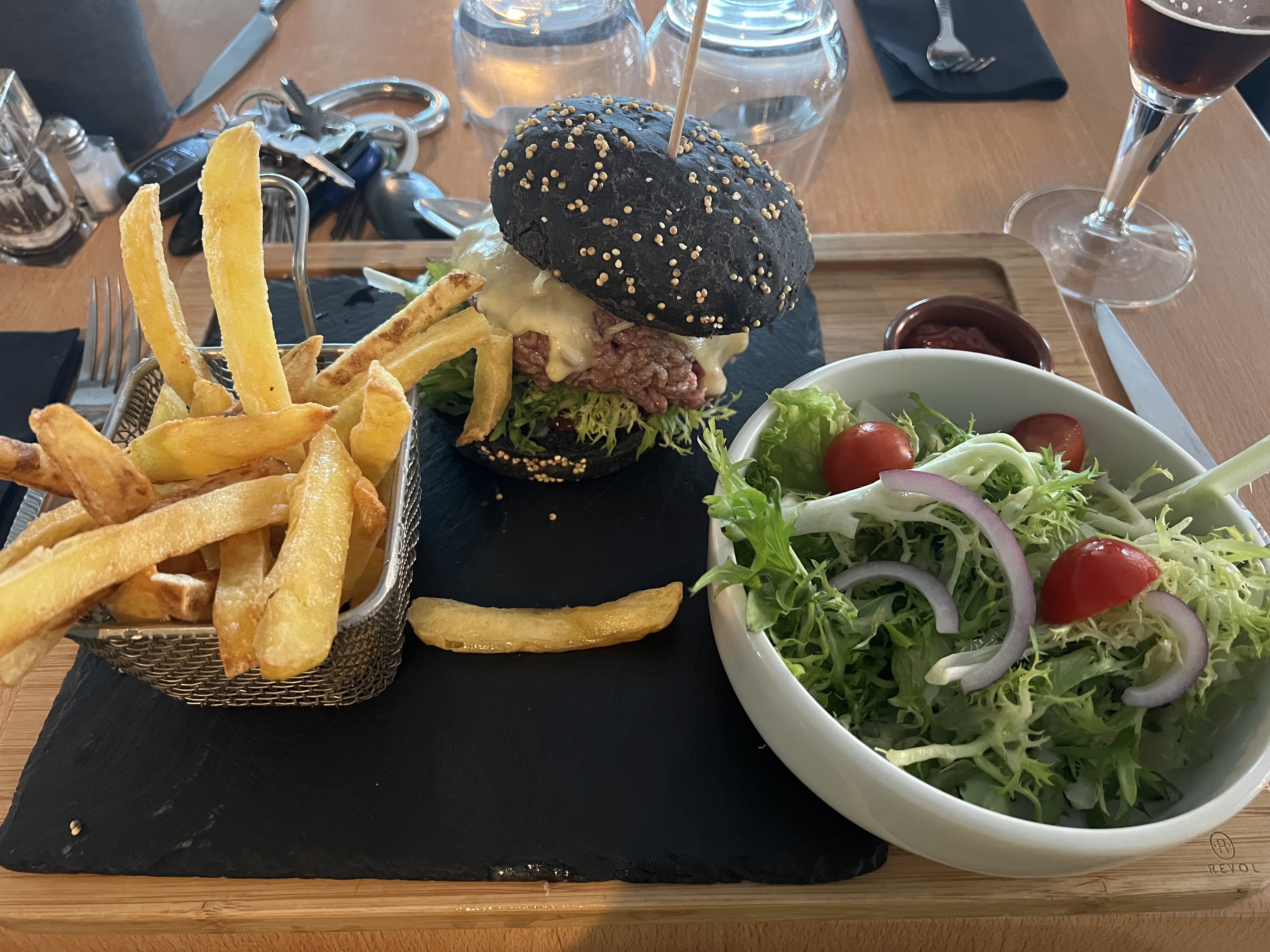 Déçu Le service long et pas très au point ( demande de la bière pression disponible : la serveuse jéte la carte sur la table en disant « c’est sur la carte ») une autre jeune serveuse qui tourne en rond dans le restaurant . Nous avons pris des burgers ; vraiment sans plus . Salade en sachet , pas de vinaigrette , deux goutes de ketchup dans le burger et frite sans goût pour 23€ un peu chère … Dommage .
