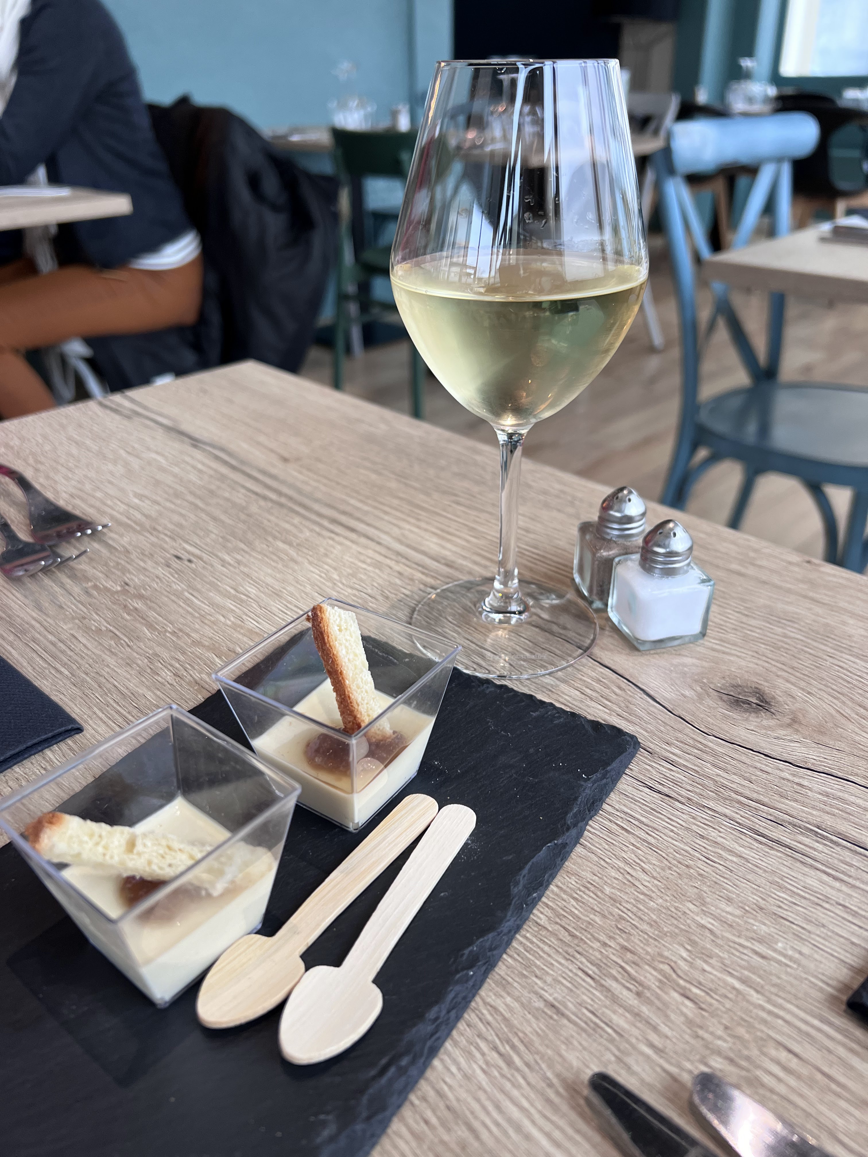 Repas d'entreprise avec une vingtaine de personnes. Repas correct mais je n'ai pas été bluffée. L'entrée (foie gras) assez bonne, dommage que l'assiette est été laissée au frigo juste avant de servir car le pain était du coup, réfrigéré 😔. Le plat trio de poisson : si le poisson était super bon, la serveuse n'a pas su me dire quelles sortes de poisson il y avait. Et quand elle a obtenu l'information, ce n'est pas ce que nous a dit le chef ensuite 🤔. Malheureusement, la purée n'était pas assez assaisonnée et je n'avais pas de sauce dans mon assiette. Pour le dessert, café gourmand, je pense que certains desserts n'étaient pas maison... Quand à l'équipe de serveurs serveuses, tous très souriants et très sympathique, malheureusement très désordonnés. Je pense que ce restaurant a beaucoup de potentiel mais qu'ils ne sont pas encore au point pour accueillir les groupes. Le service était assez long.