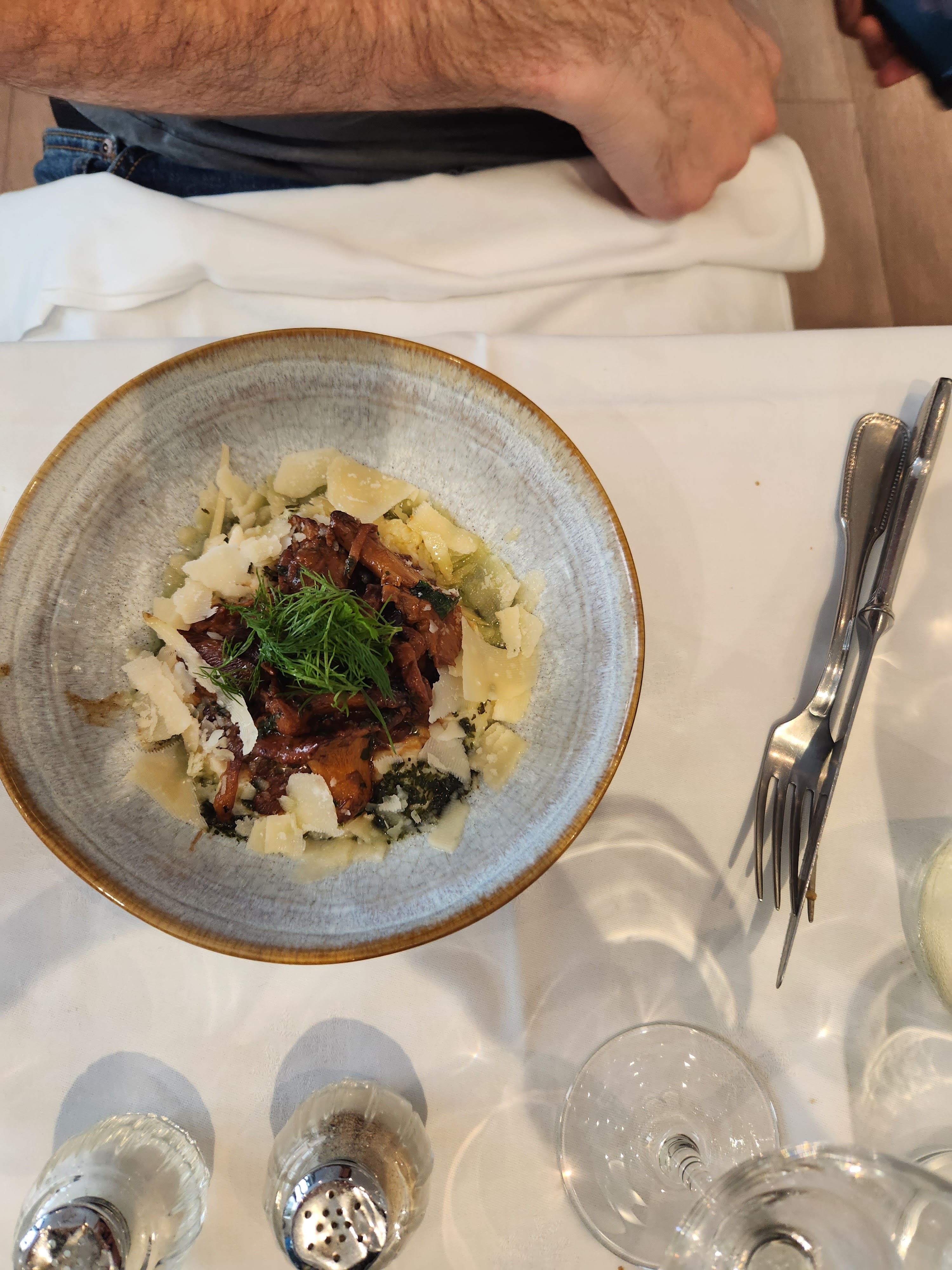 Établissement chaleureux à l’ambiance familiale, la salle est calme, les tables sont bien espacées donc c’est agréable pour discuter. Tout est fait maison, avec des produits de bonne qualité et la carte est étoffée. J’ai pris des ravioles viande crevettes pour 20€. Seul regret : que les portions ne soient pas plus importantes. L’autre photo est une poêlée de noix de Saint-Jacques aux cèpes (25€).
