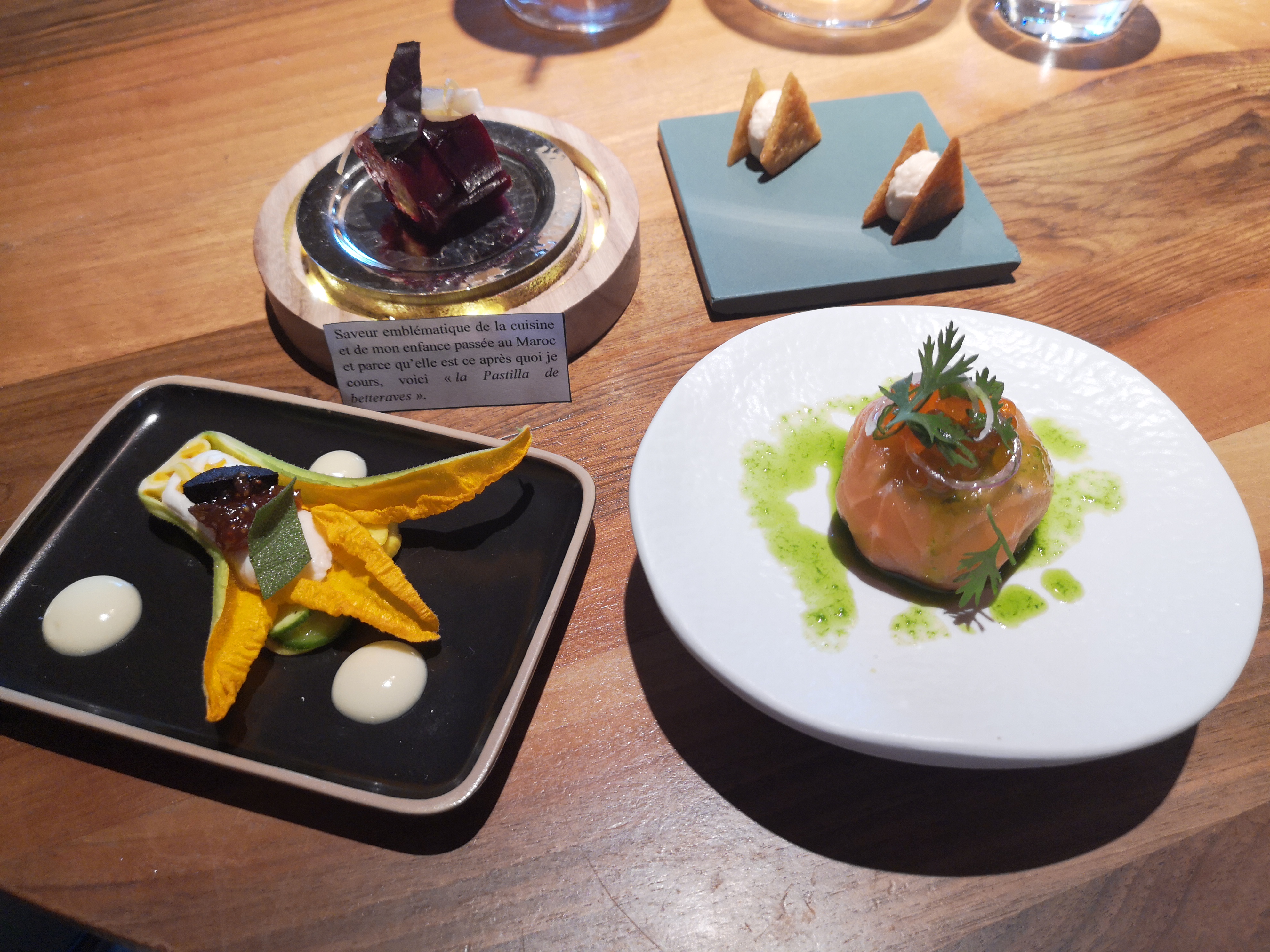 Dîner fantastique avec ma conjointe. Les goûts étaient présents, une cuisine française, méditerranéenne et avec des touches marocaines. Nous avons opté pour le menu en 8 plats avec accords mets vin en demi verre, ce qui nous a permis d’associer chaque plat à un vin ou liqueur, rendant le repas magique. Le lieu est très charmant, le personnel d’une extrême gentillesse et, plus détendu que dans certains établissements similaires que nous avons pu faire. Cela a été très agréable d’avoir pu échanger avec eux. Le chef est personnellement venu nous présenter son plat signature, qui, je trouve, est un vrai plus. La cave dispose d’un grand choix, et, le sommelier a su bien nous guider. Bravo au chef et sa brigade de cuisine. C’était pour nous un sans faute. Merci