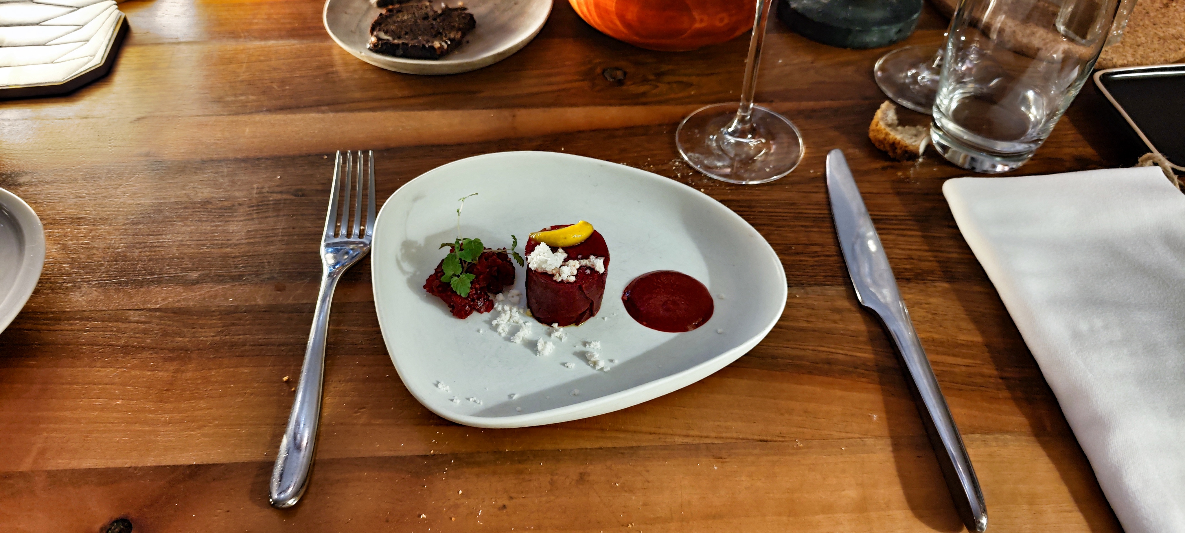 Tout est magique : l'environnement , les locaux , le personnel , les mets très bien présentés que ce soit verbalement et dans l'assiètte , les vins avec une belle explication de texte.......allergique à la betterave , j'ai tenu à gouter ce produit revisité et.........là...pfuuuu , explosion de papilles ! Un feu d'artifice de saveur , un repas interieur en pleine nature , merci !