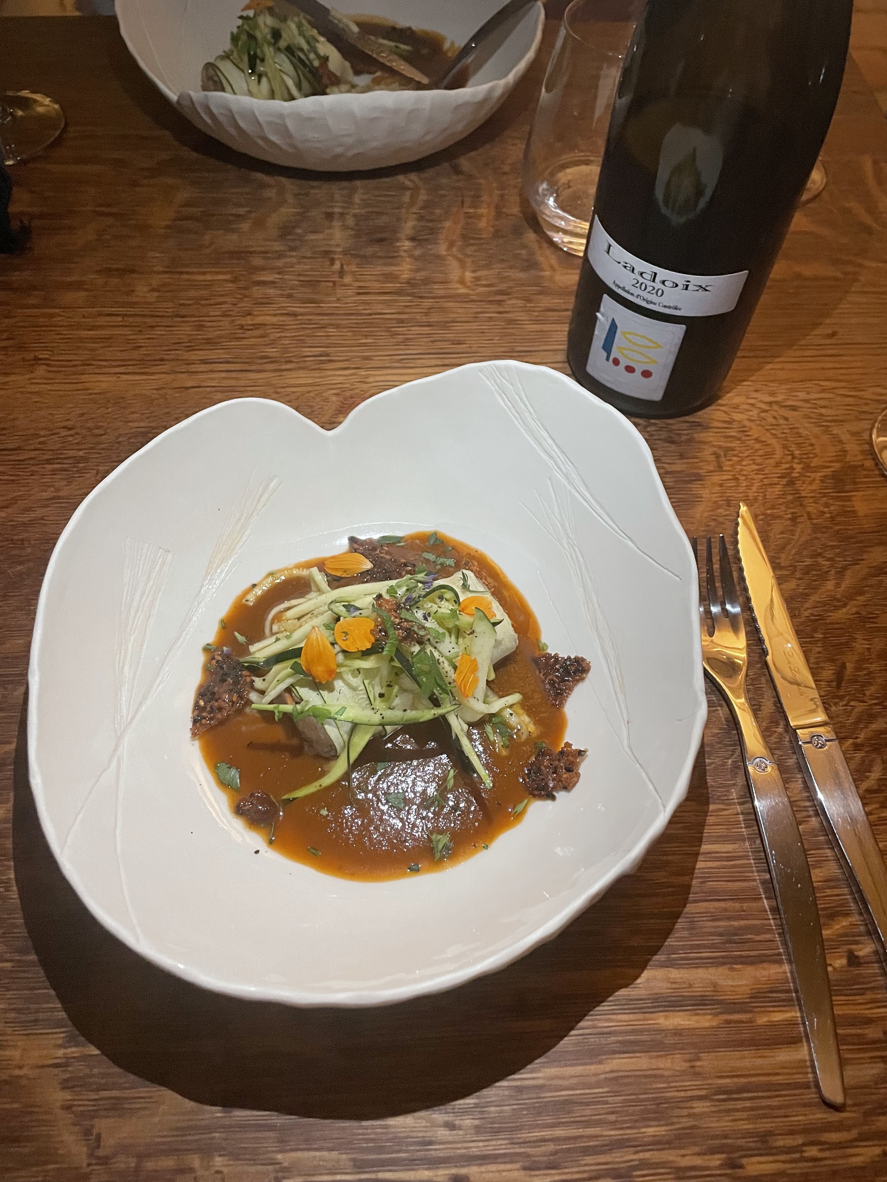 Et voilà, il a recommencé 😬. Tony, le chef, a encore une fois réussi à me faire manger, mais surtout à me faire adorer des légumes qu'habituellement, je n'aime pas ( je suis très difficile....). Tout était encore succulent, surprenant. Mais où va t il chercher tout ça ???? Nous en avons encore une fois pris plein les papilles !!! Là dessus, un excellent vin ( les conseils de Tony et Marion sont toujours justes). Si on rajoute la bonne humeur de l'équipe, l'humour et la qualité de service, vous comprendrez que nous avons une fois de plus passé une excellente soirée. Et on ne compte pas s'arrêter là !!!!