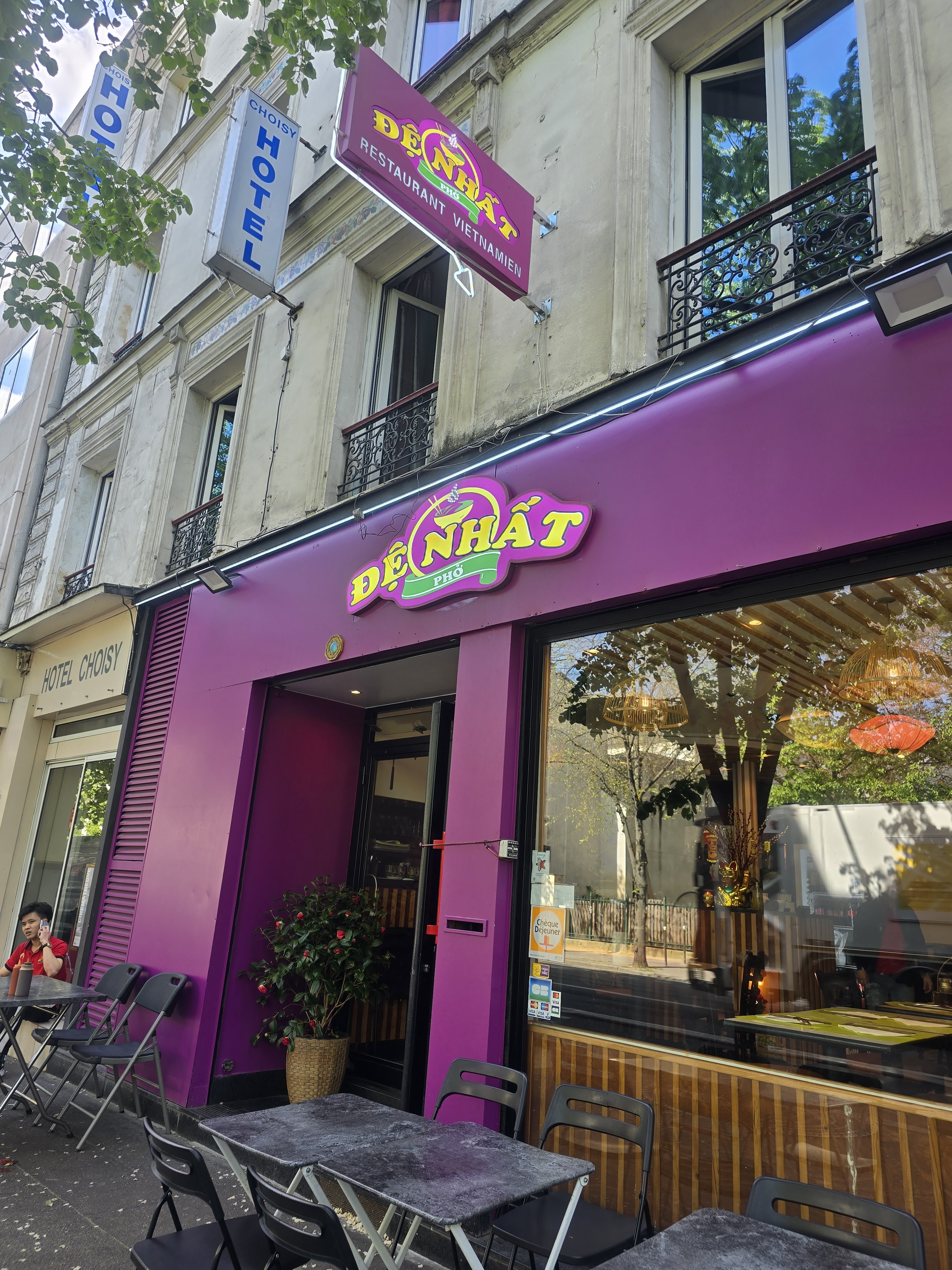 Il s’agissait d’une chasse ponctuelle à un bol de pho bien chaud après avoir visité un marché aux puces voisin. De Nhat était très complet à l'heure du déjeuner et nous avons réussi à avoir une table sans attendre. Nous avons commandé un Pho Tai (avec du bœuf saignant) et un Pho Tai Chin Bo Vien (avec du bœuf cuit saignant et des boulettes de viande). Les deux étaient corrects mais ne vous réserveront pas de surprises. Ils ont réussi à satisfaire notre envie de saveurs asiatiques ce jour-là. Le personnel est généralement efficace et agréable. ] J'essaierai d'autres restaurants Pho sur l'avenue de Choisy la prochaine fois.