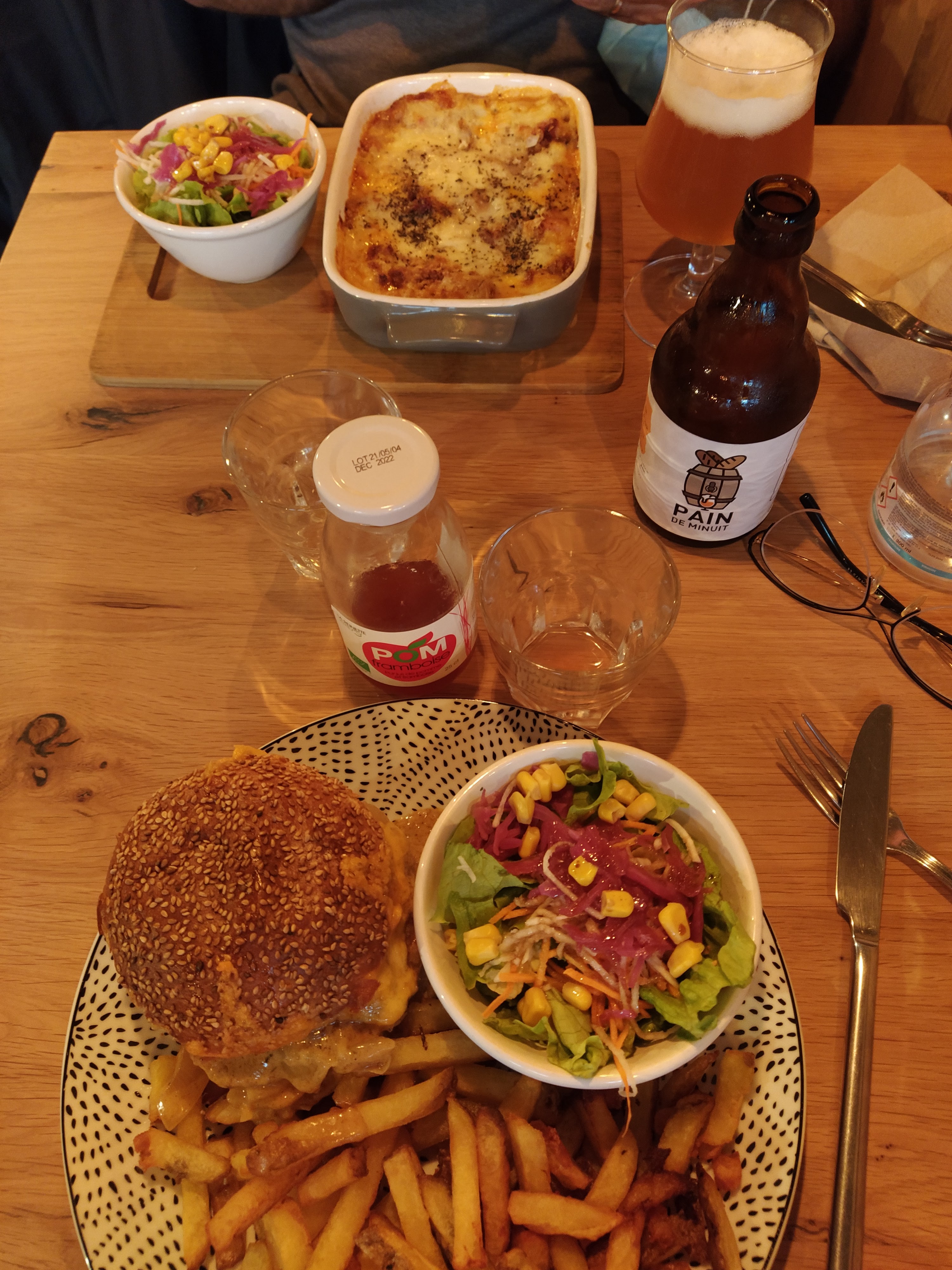 J'ai rarement mangé un aussi bon burger (viande), la sauce (secrète ?) incroyable. Le reste de la table était ravi également avec burger végé (une autre sauce tout aussi bonne) et poulet maroilles. Une super adresse !