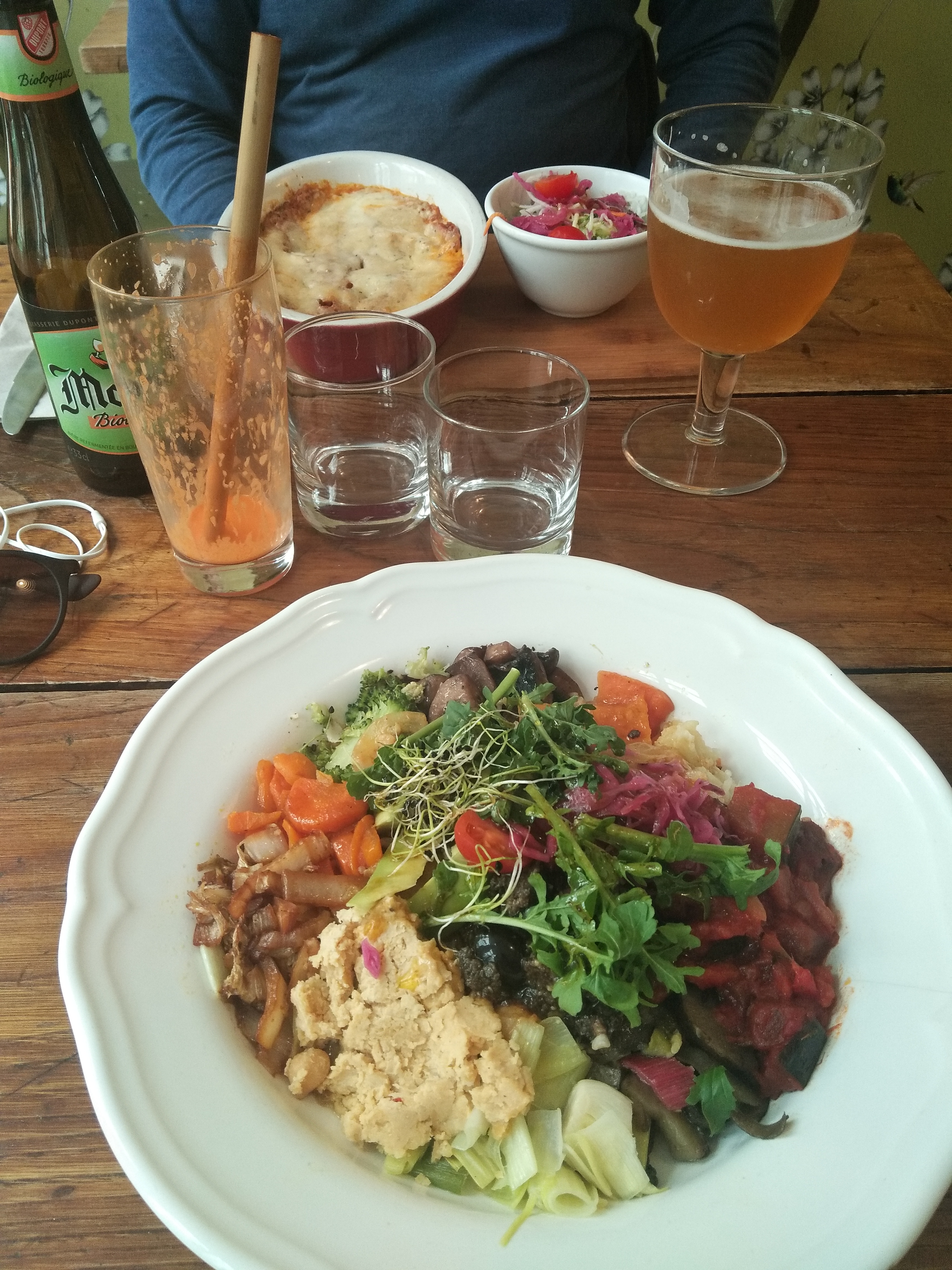 Nous avons choisi deux plats végétariens, qui étaient bien copieux et surtout délicieux ! Ça n'était pas à la carte, mais il y avait une bière à base de pain rassis issu des restaurants locaux... Pour résumé, un restaurant délicieux ET respectueux de la nature ! On y retournera