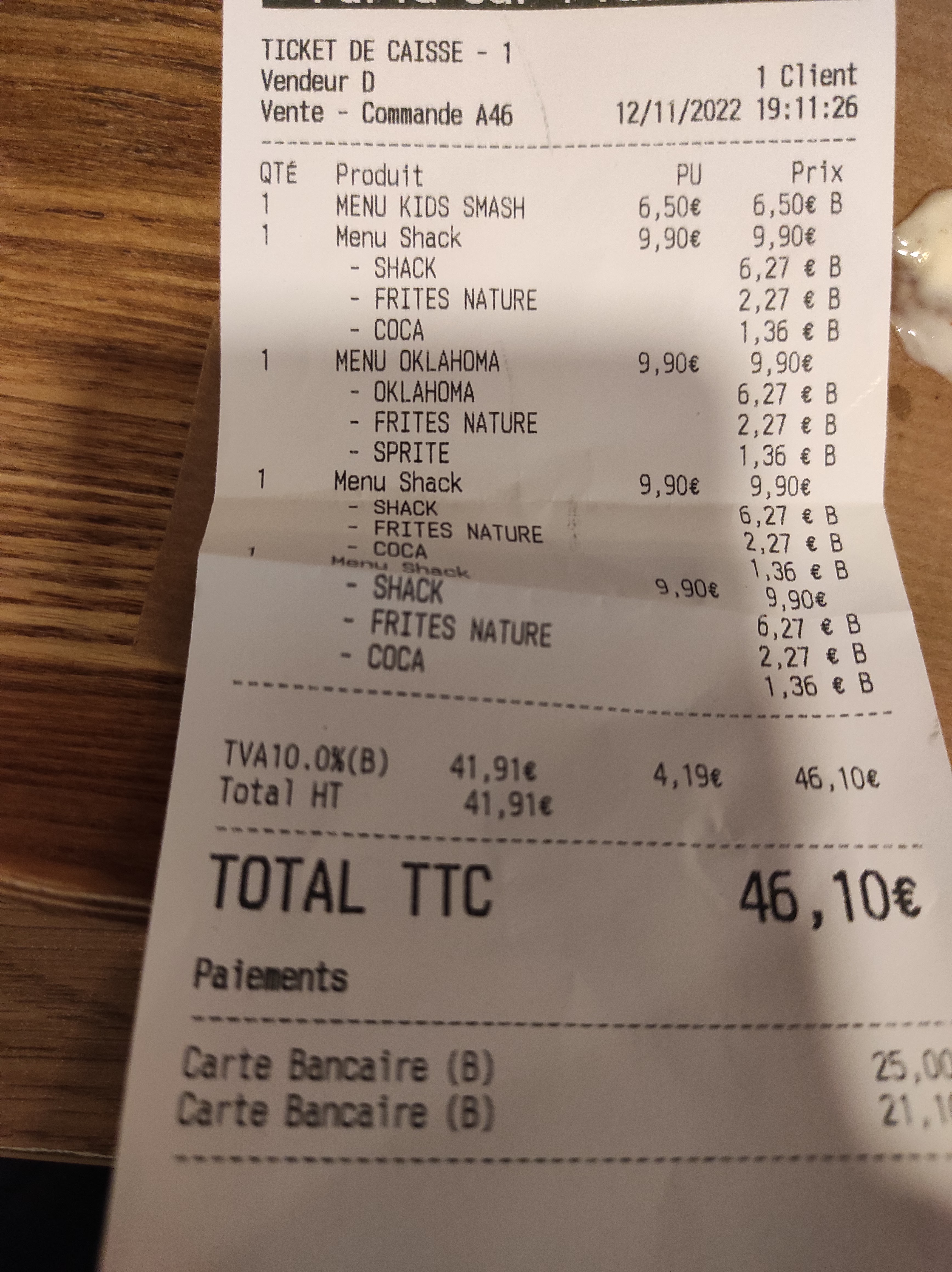 Nous avons commandé deux menus : Oklahoma et Shack. Les burgers étaient très bons : le pain était brioché et léger, le burger Oklahoma était délicieux avec les oignons et le Shack excellent. L'accueil a été aux petits oignons avec le service à table et un employé a même débarrassé nos plateaux alors que nous allions le faire. Petit plus avec la commande aux bornes, cela permet de prendre notre temps pour choisir notre formule.