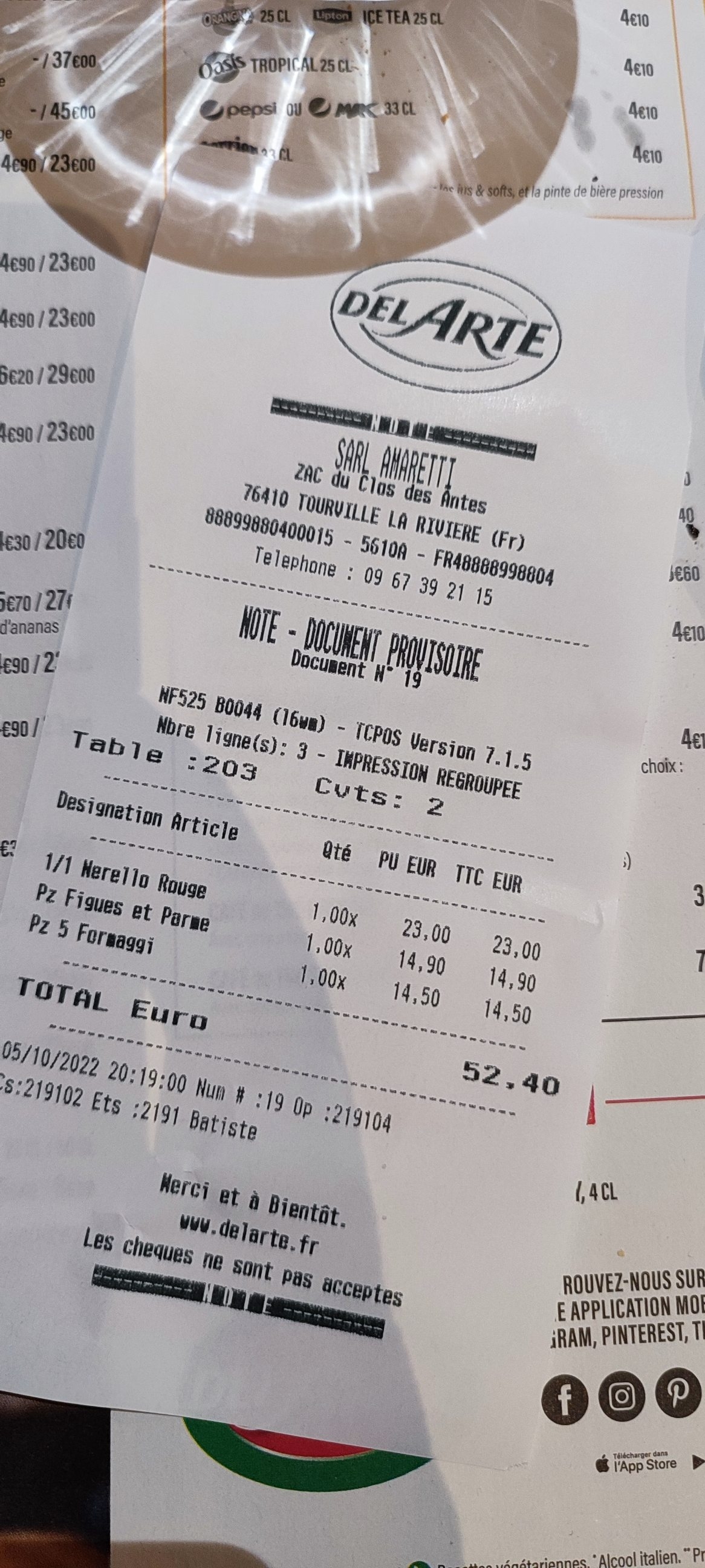 Bonjour, quelle déception en allant manger avec ma fille chez delarte de tourville la rivière, nous avons attendu 30 mn avant de nous installer à table, table située à côté d’un mur à l’hygiène vraiment écoeurante, obligé de faire changer la fourchette de la fille qui avait des morceaux de pizzas encore dessus, et le pompom, un caillou dans mon assiette de pâte au saumon, la serveuse m’a changé l’assiette en me disant que c’était un morceau de noix, moi qui suis allergique a tout ce que est à coque…. L’hygiène du restaurant est vraiment à revoir…