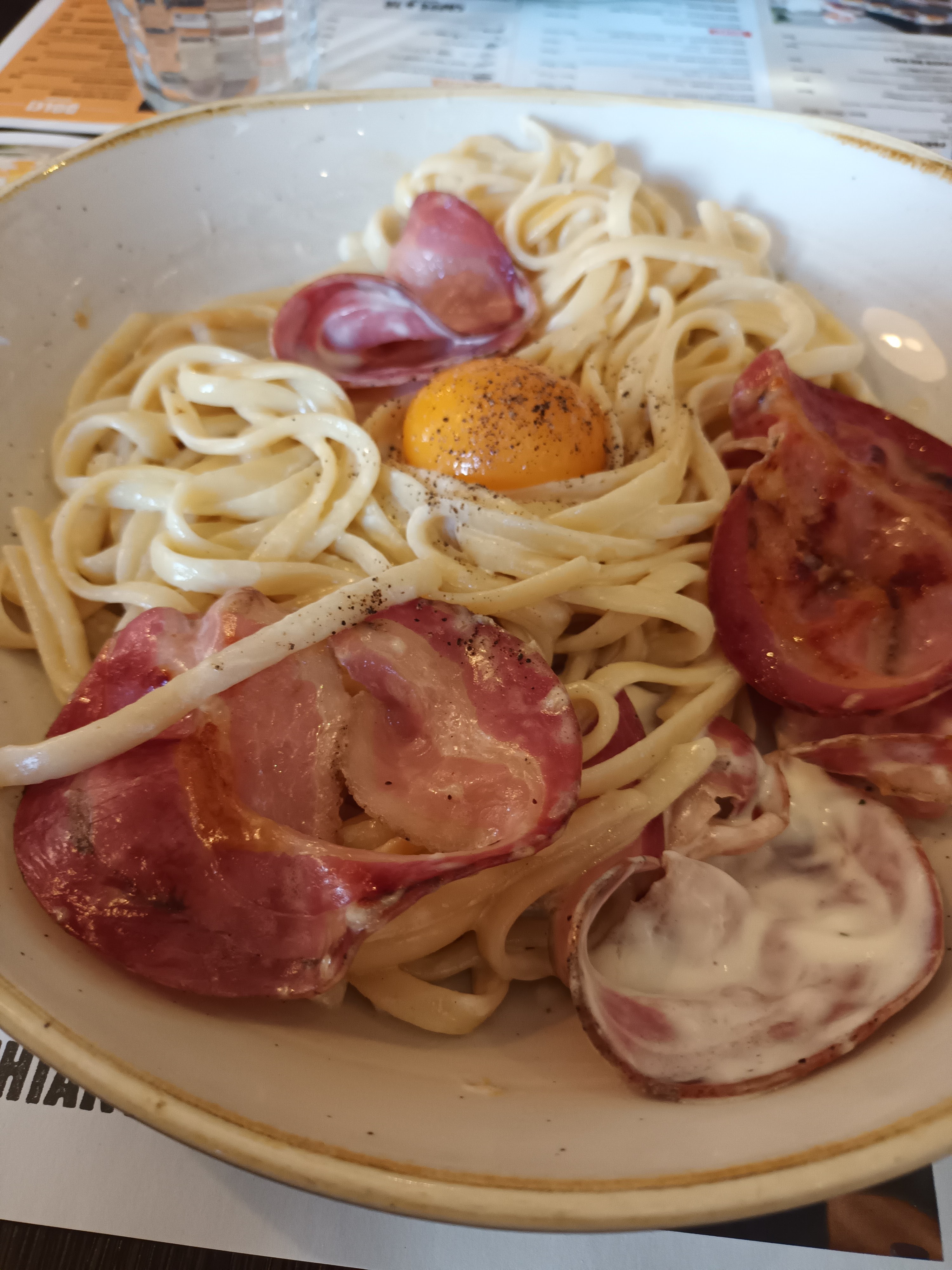 Attente très , voit trop longue pour une pizza et des pages carbonara ( pâtes , crème , coppa) pas d oignons rien de plus 😐 La serveuse ( probablement une débutante ) ne nous pose même pas la question de savoir si notre enfant de 2 ans a besoin de son plat en même temps que notre entrée ( aux adultes ) Donc notre fille a mangé son plat a 13 h40 ! La pizza 🍕 la plus grande est trop petite , elle est pas grande elle est moyenne voir petite . Décevant . Aucun dynamisme , ça percute pas des masses . On y retournera pas