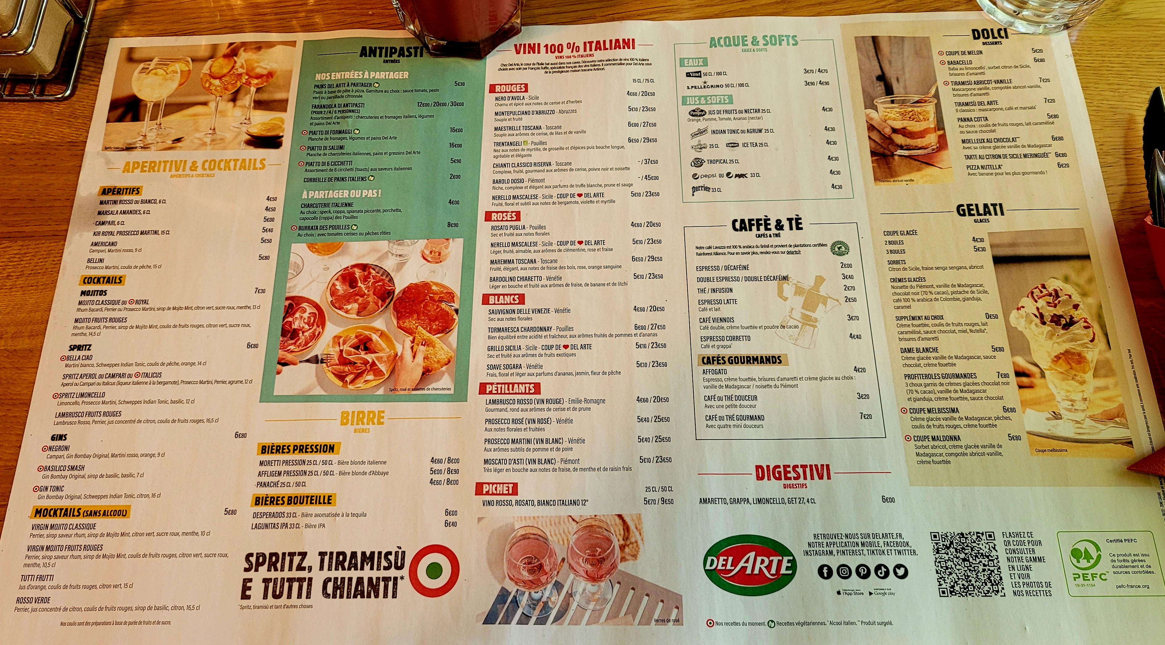 Quand on a connu la Tabla pizza en lieu et place pendant dix ans , la franchise Del Arte tire vraiment le lieu vers le bas , c'est franchement pas bon , le verre de rosé est un échantillon, a peine rempli à moitié ,réponse du serveur c'est la dose préconisée par la direction et de rajouter sinon, bah il y a des bouteilles merci jeune homme je ne manquerai pas de me souvenir de cette somptueuse réponse et votre ton sarcastique , l'escalope de veau Firenze n'est qu'une rissolette surgelée de viande reconstituée que l'on trouve dans les cantines scolaires mais c'est pas le même prix , de plus bien trop cuite et sans sauce tomate sur les pâtes comme le montre la photo de la carte .Le gâteau qui accompagne le café douceur est immangeable, une sorte de beignet décongelé saupoudré de chocolat mais qui as du stagné au frigo depuis plusieurs jours, on a eu droit à un ourson en chocolat emballé en échange, apporté par la responsable de salle au sourire pincé, on ce moque franchement du client ici . Addition de 190 euros pour 5 personnes .... A fuir et surtout à oublier . Les photos montre celles de la carte et celles des produits servis.
