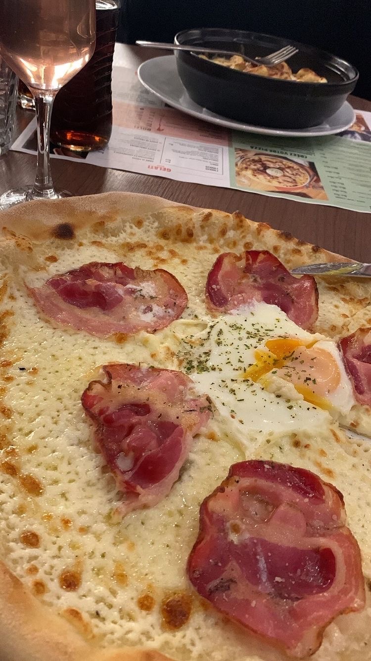 Pizza avec pâte ultra fine pour ne pas dire inexistante. La crème et l oeuf coulent directement sur l assiette! Serveur plus que difficile à solliciter et lorsqu on le fait pour avoir de l eau il répond oui mais après...En signalant l absence de pâte lors de l encaissement une remise de 10% est appliquée. Mais il aurait été bien mieux d avoir à manger dans une assiette et de ne pas devoir finir de dîner chez l enseigne voisine ! Même pas de au revoir après avoir payé!!!! On ne vous remercie pas pour votre service. Vous ne nous reverrez plus jamais !