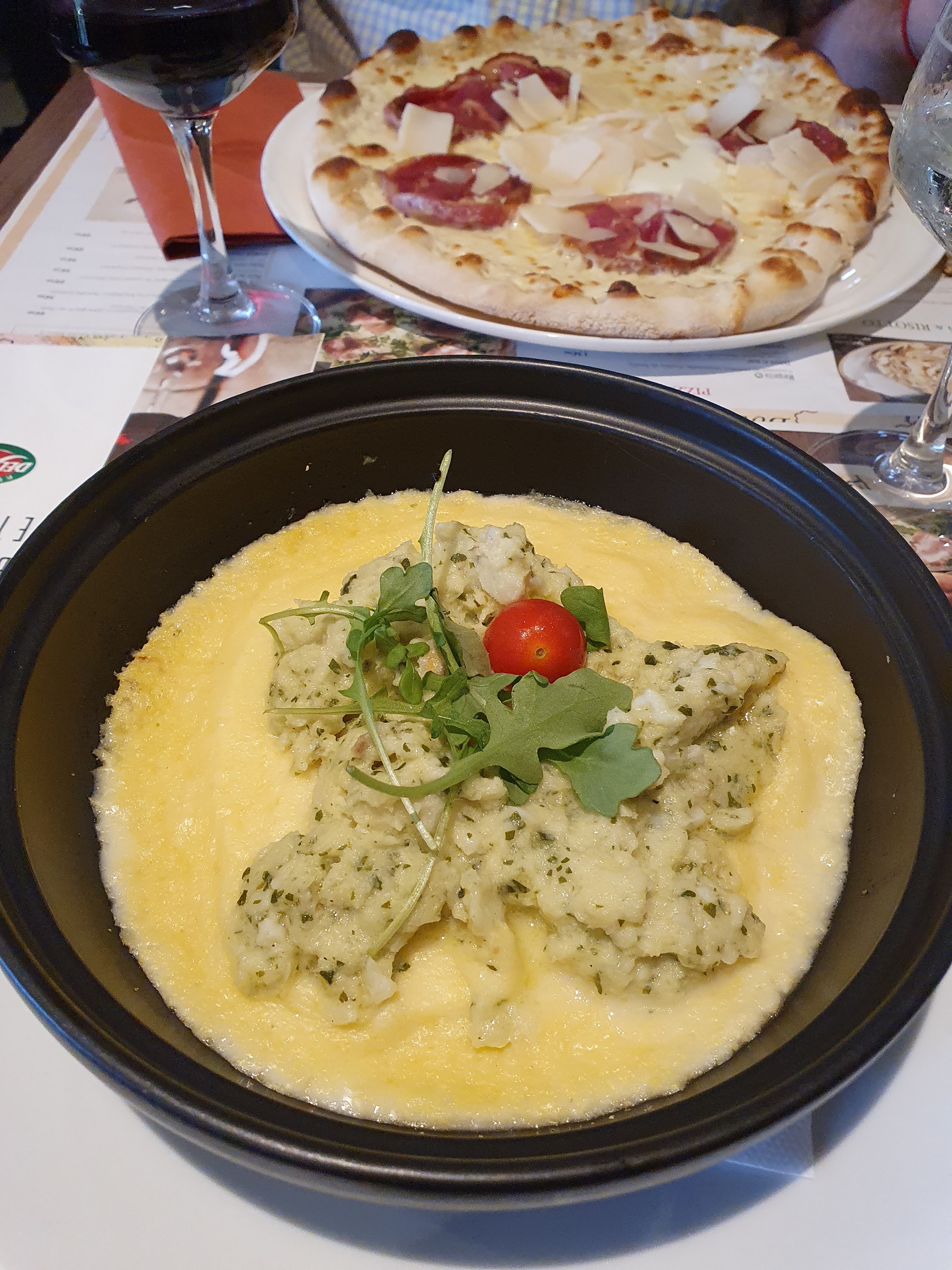 Les gnocchis étaient tellement cuit que c’était de la purée….. et le poulet était tout aussi cuit donc un peu noir…. Sinon deux bonnes pizzas, cela dit, identiques sur le menus mais différentes dans les assiettes…..