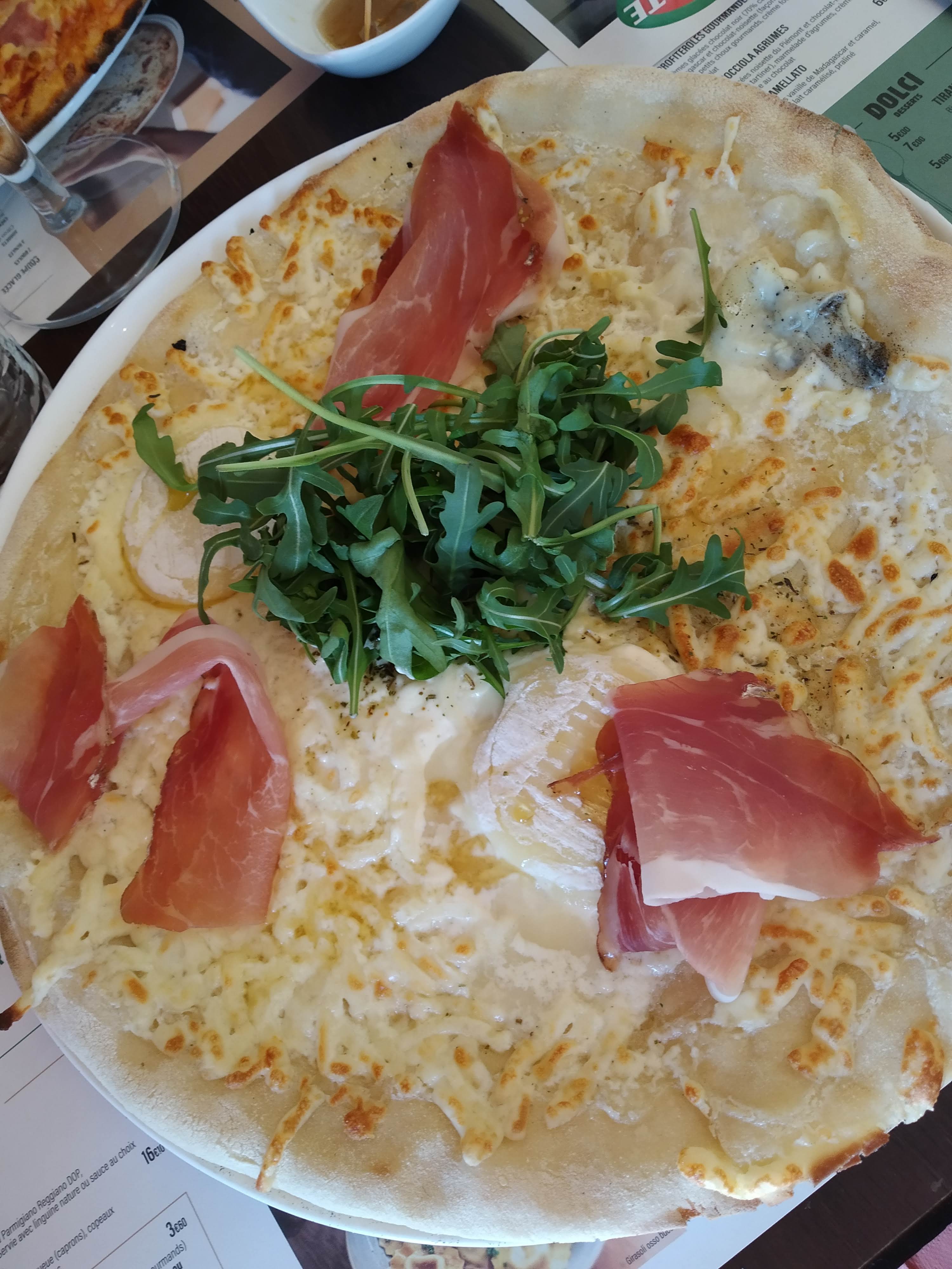 Beaucoup de monde mais servi vite tous en même temp parfait ma pizza création base sauce tomate mozzarella jambon spek merguez oeuf oignons une tuerie la meilleure pizza de ma vie 😀😀😀😀 longtemps que j'avais pas aussi bien manger merci a Hugo qui a ete très agréable ce soir