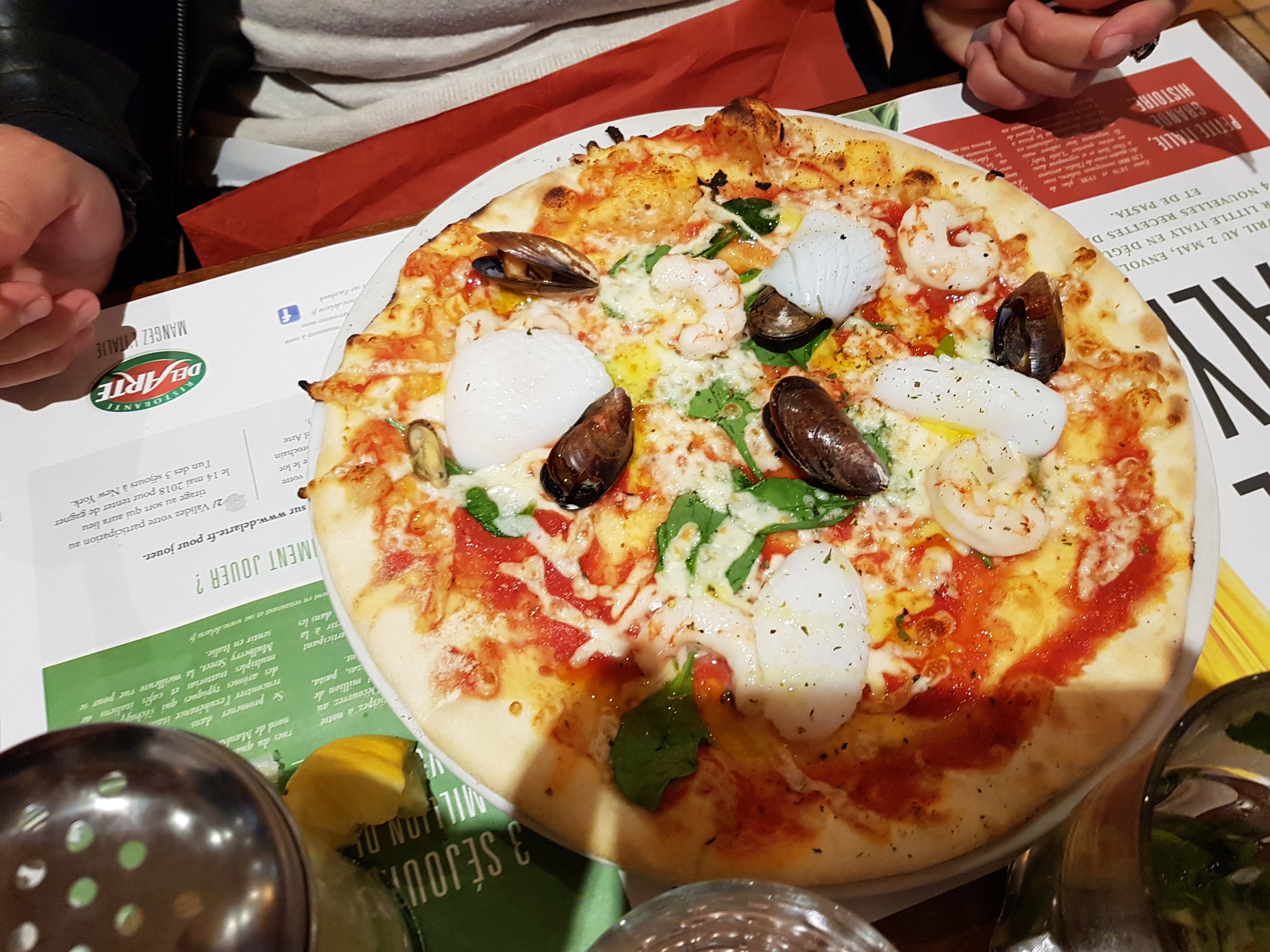 C'est mauvais, pas bon, mais pourquoi ce restaurant est plein? Nous y sommes allés un samedi midi, le restaurant était plein, il y avait la queue dehors. Nous avons pris une pizza petit format aux fromages pour madame et une aux fruits de mer pour moi. Et là, c'est la déception la plus totale. Celle au fromage est ridiculement petite à tel point qu'ils mettent un peu de salade dans l'assiette pour combler le vide. Celle aux fruits de mer n'est pas bonne. Évidemment, c'est des sachets de fruits de mer congelés qui est mis sur une pate fine , mais il serait judicieux de la faire cuire un peu plus. Les fruits de mer rendent de l'eau au possible , la persillade baigne dans l'eau, je répète ce n'est pas bon surtout avec des bouts de coquilles qui croustillent sous la dent Ce qui rajoute une étoile, c'est le dessert , tiramisu au Nutella qui est bon mais à 8€ , ça pique. Le lieu est lui pas mal. Seul le service est agréable . Le serveur au petit soin malgré le monde , merci donc Victor 👍. Dernier point, en prenant la carte de fidélité , il est dit que l'on a 10% sur la note. Mais arrivé à la caisse, il nous ait dit que ce ne sera que la prochaine fois. Finalement, je ne profiterai pas de cette remise car je n'y retournerais pas. Je ne conseille vraiment pas...