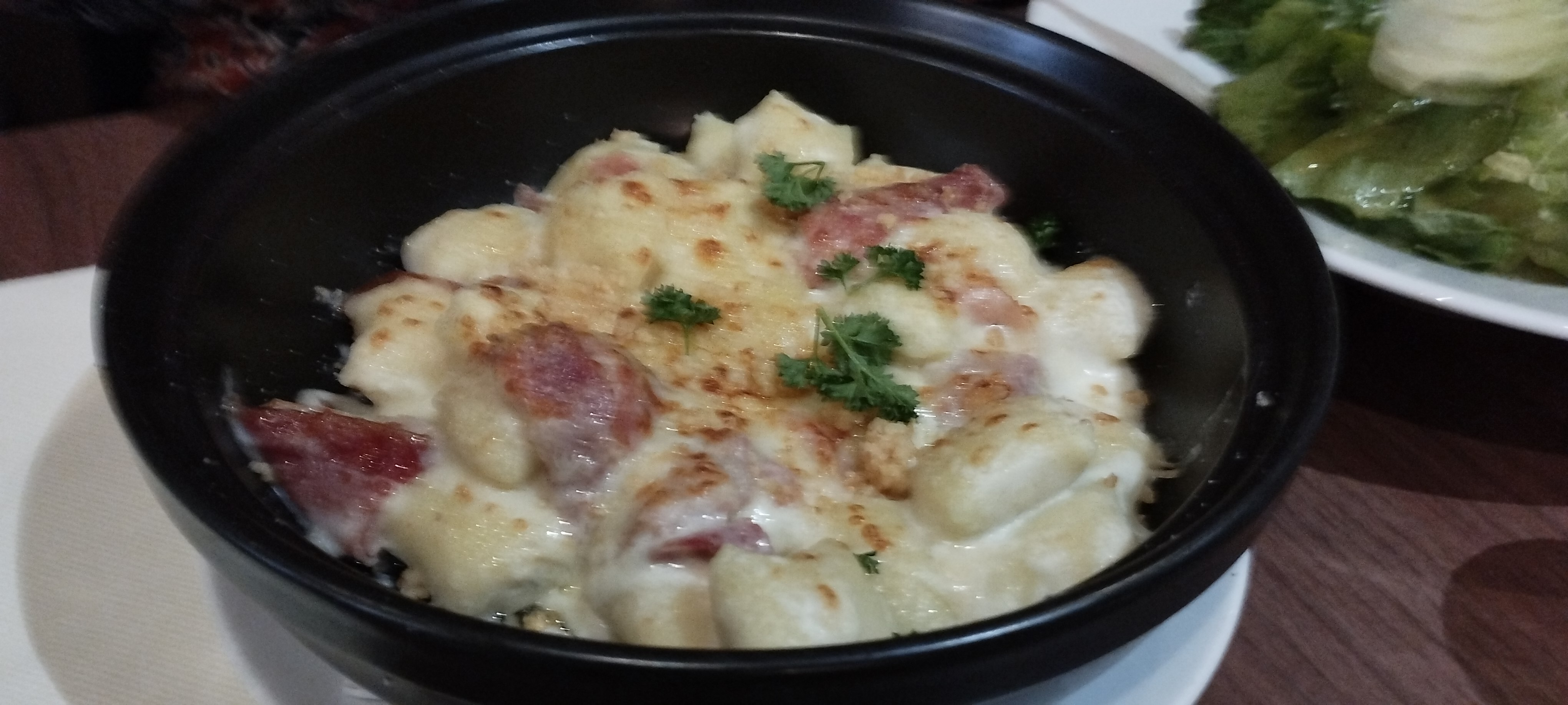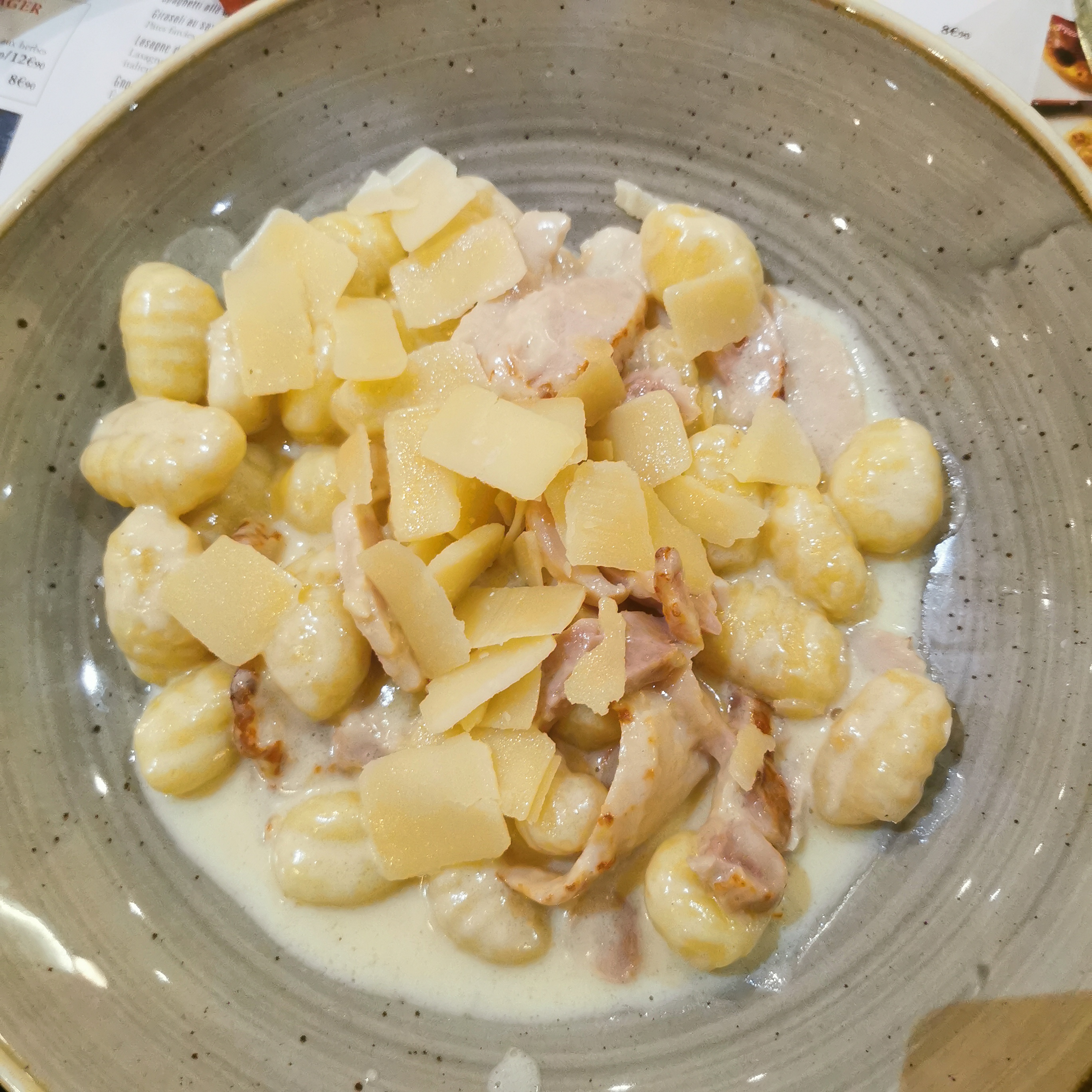 À peine arrivés au restaurant on nous annonce le délais d’attente car pas de réservation. Le plat gnocchis pas mal mais la salade césar une cata ! Pour ce qu’il y a dedans elle est très chère et pas bonne. Le service a été fait, la carafe d’eau a été oublié. Vraiment j’étais très déçue. Je n’y retournerai pas. Pour répondre, il y avait bien du poulet mais pas de pencetta. Malgré tout la salade césar très light en ingrédient.