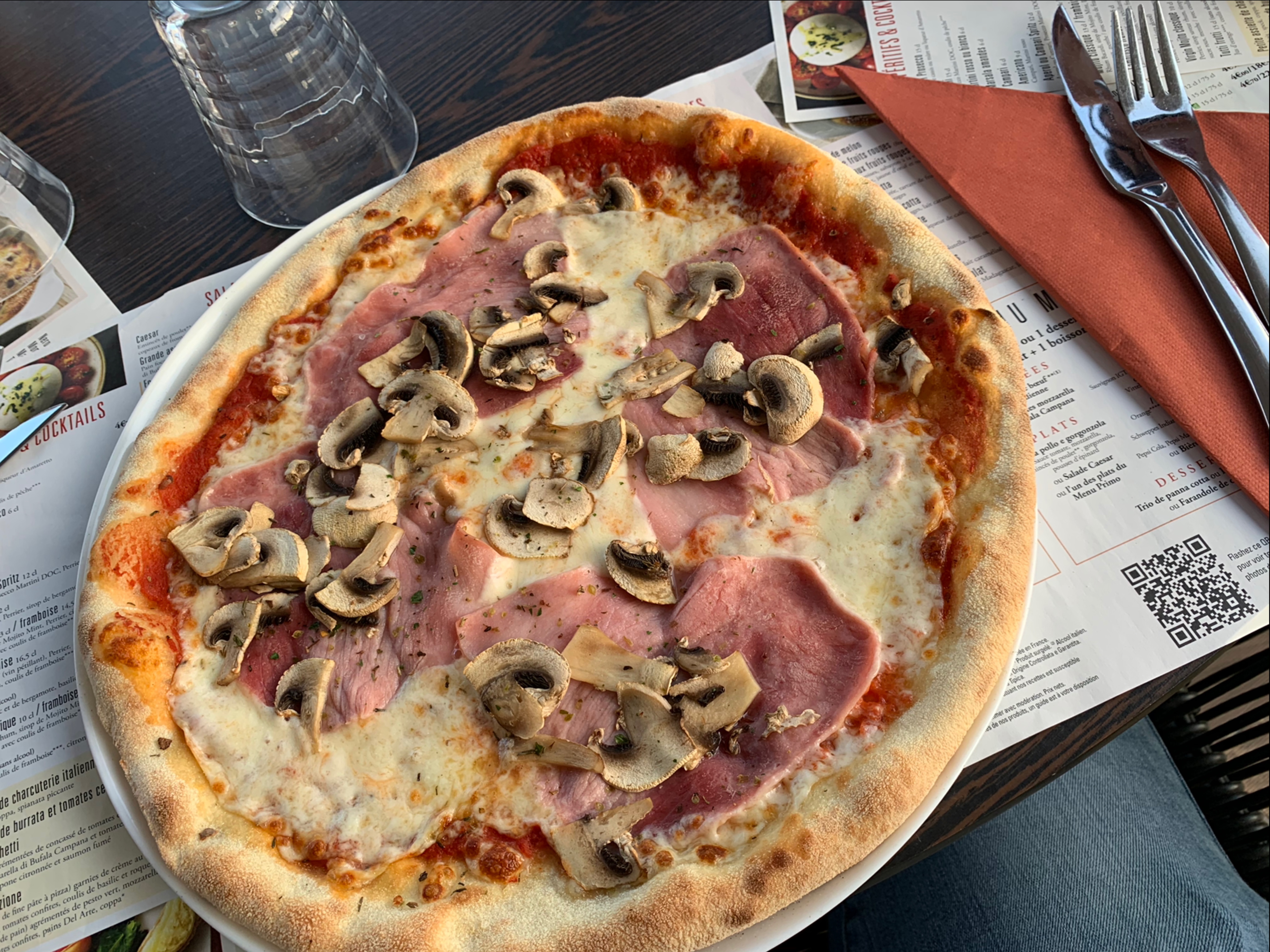 pizzas pas terribles, sans goût..., 3 cm de tour sans rien dessus ??? donc sec, le minimum de garniture que ce soit le jambon ou les champignons ils sont coupés hyper fin donc bilan rien à manger mis à part de la pâte... trop cher pour ce que c'est.... de plus installés contre une vitre il ne faisait pas chaud.