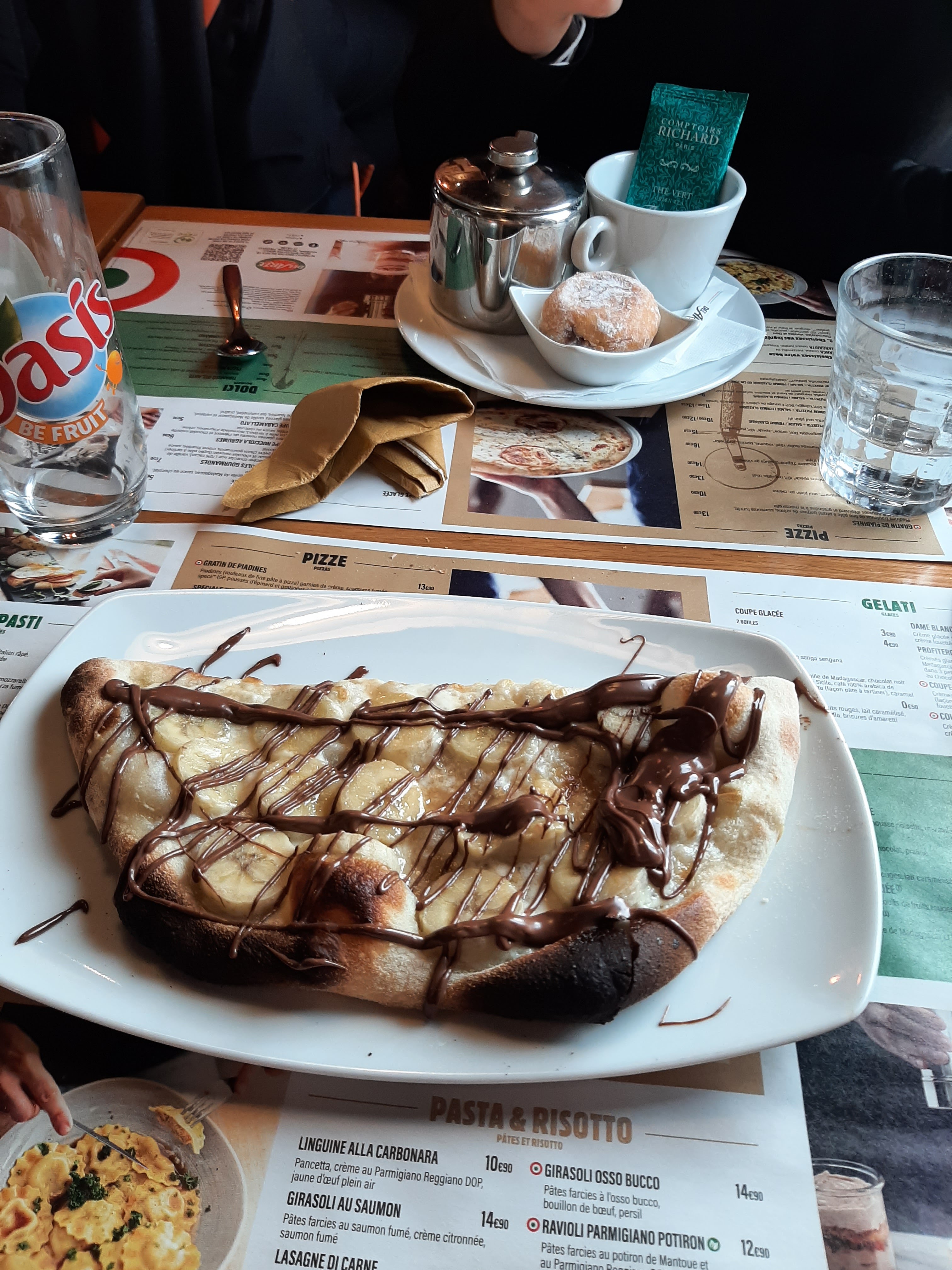 Pizza dessert au Nutella-Banane très bonne mais calzone très très décevante, pas beaucoup de goût, normal j'ai envie de dire à cause du très peu d'ingrédients à l'intérieur