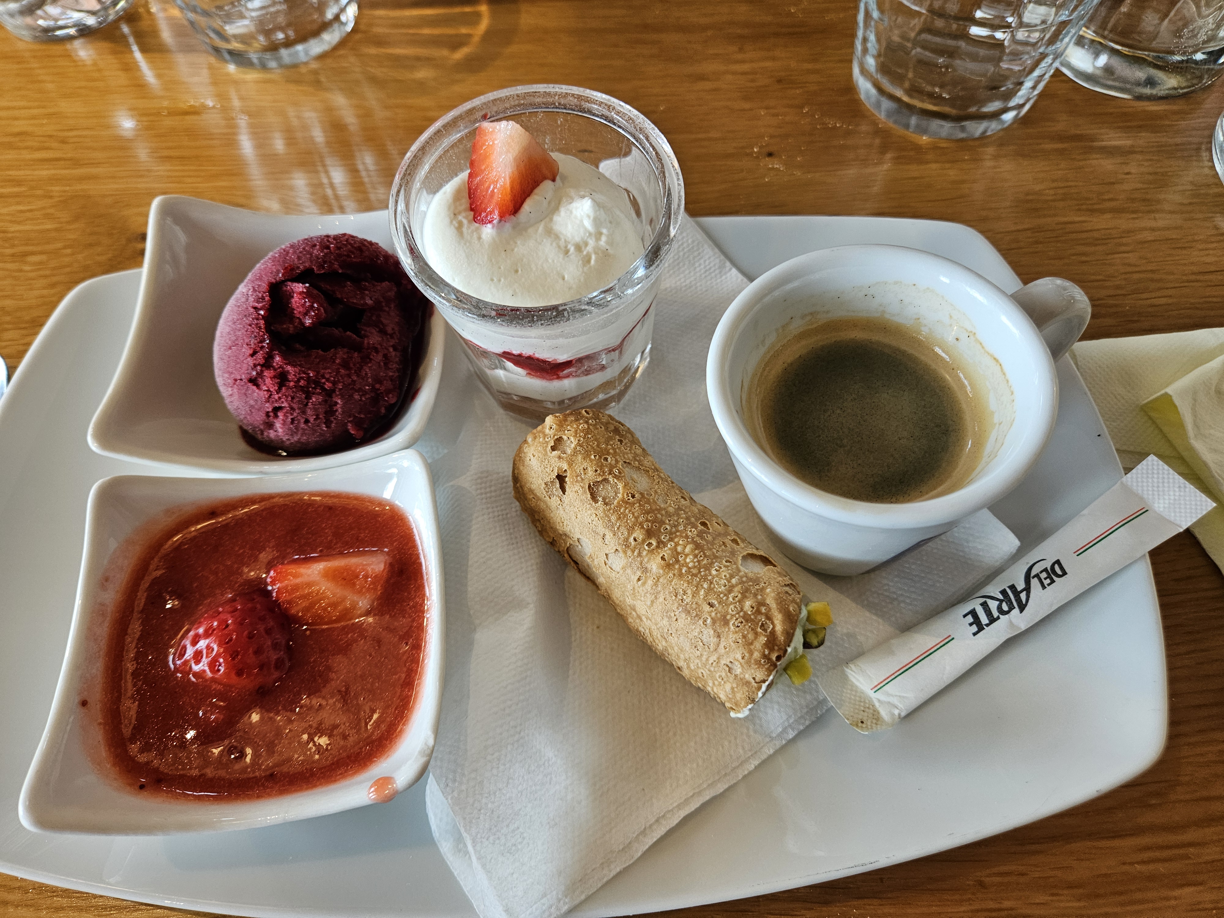 Service correct mais la propreté n'est franchement pas au rdv. Ma première tasse était usagée et non lavée... Celle qu'on m'a rapportée n'était pas beaucoup mieux (photo ci-contre). Et d'un del arte à un autre (pacé/alma), et pour le même plat pasta degustazione, on m'a servi tantôt des lasagnes et tantôt des pâtes bolognaise...