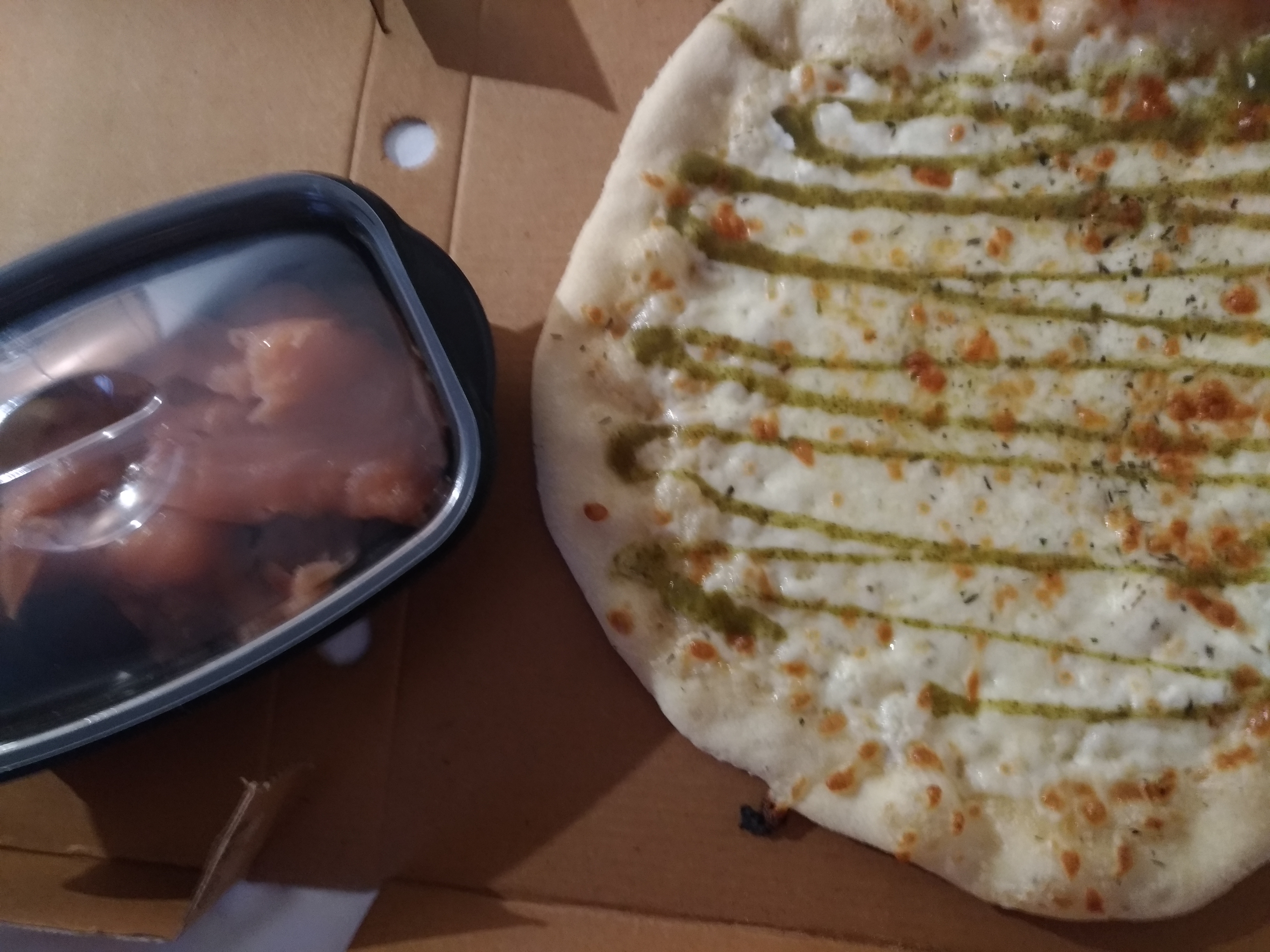 Pizza très grasse, quelques feuilles fanées de basilic avec leur queue de 2cm, sans goût, j'ai essayé la pizza saumon, mais pas top.