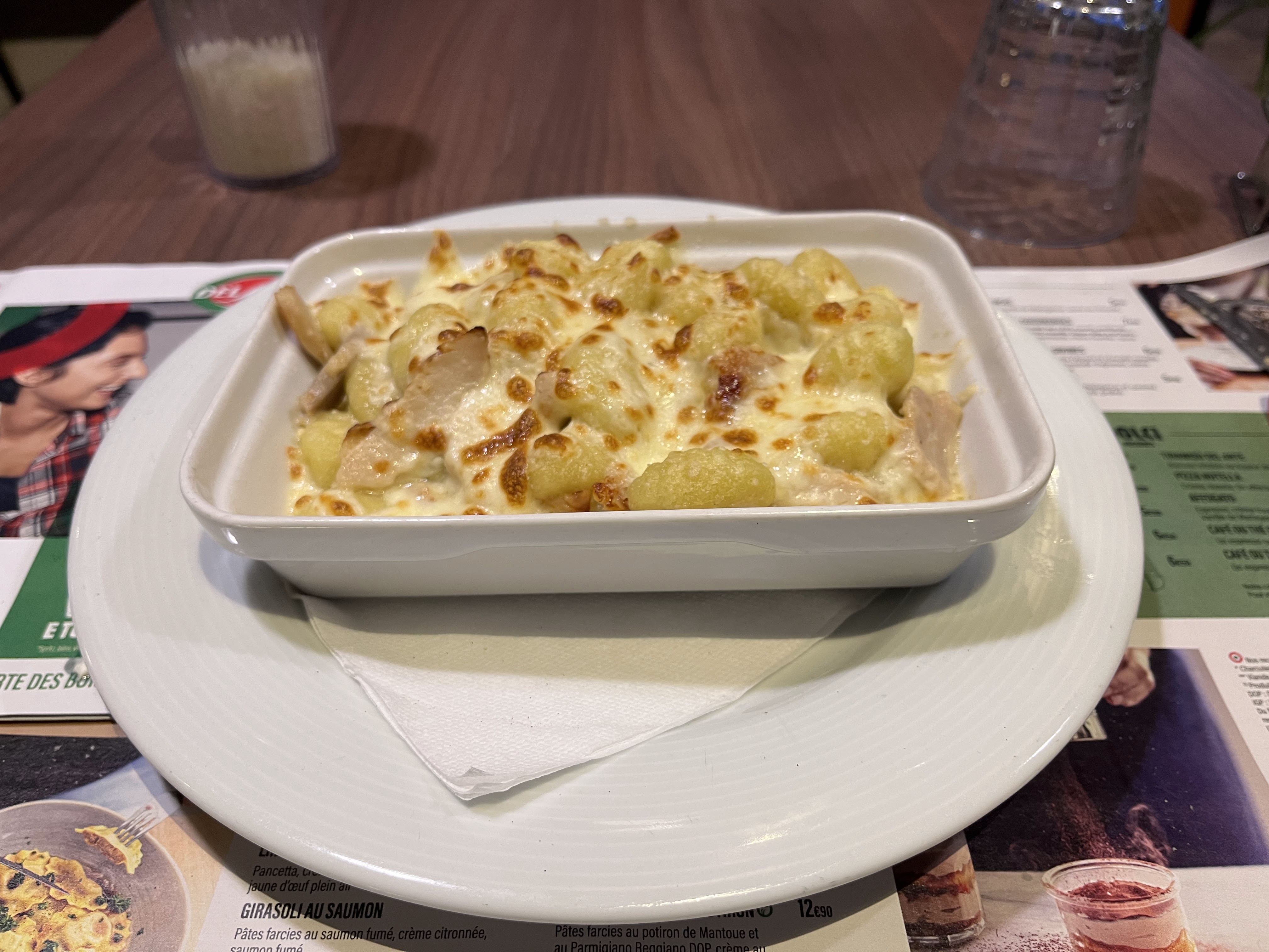 Pas beaucoup de saveur sur ma pizza pourtant elle aurait dû , tu te demandes ce que tu manges , vraiment sans intérêt . Les gnocchis crèmes et aux poulet pareils , à peine mangeable . Une fois mais pas deux