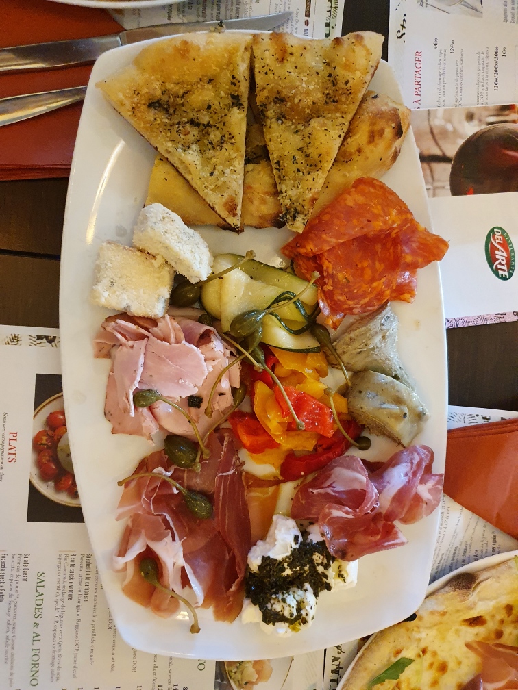 Nous avons partagé différents plats, type pizza, pâtes, fromage, salades. Service impeccable pas d'attente entre les plats. Et toujours le sourire de tout le personnel.