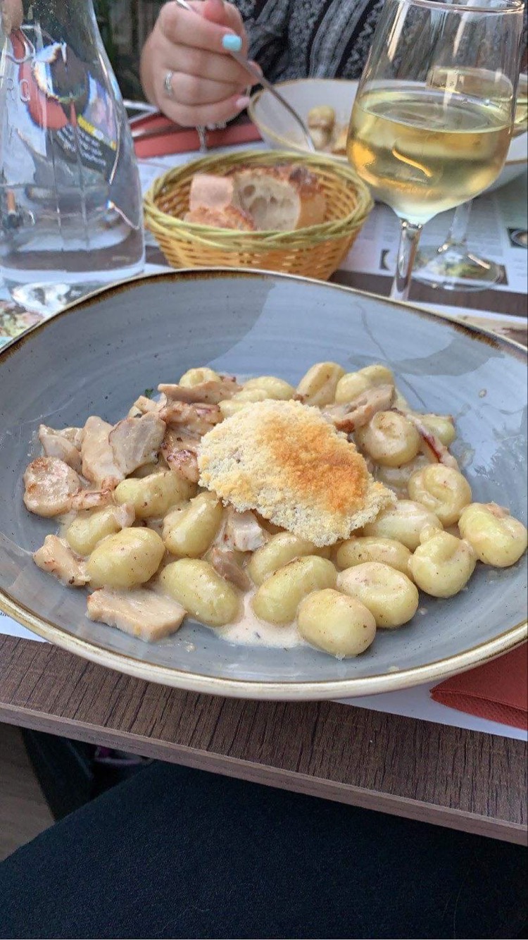 Gnocchis très épicés 🥵..pizzeria saumon et chèvre miel délicieuses... accompagnées d un verre de proseco rouge... très correct...