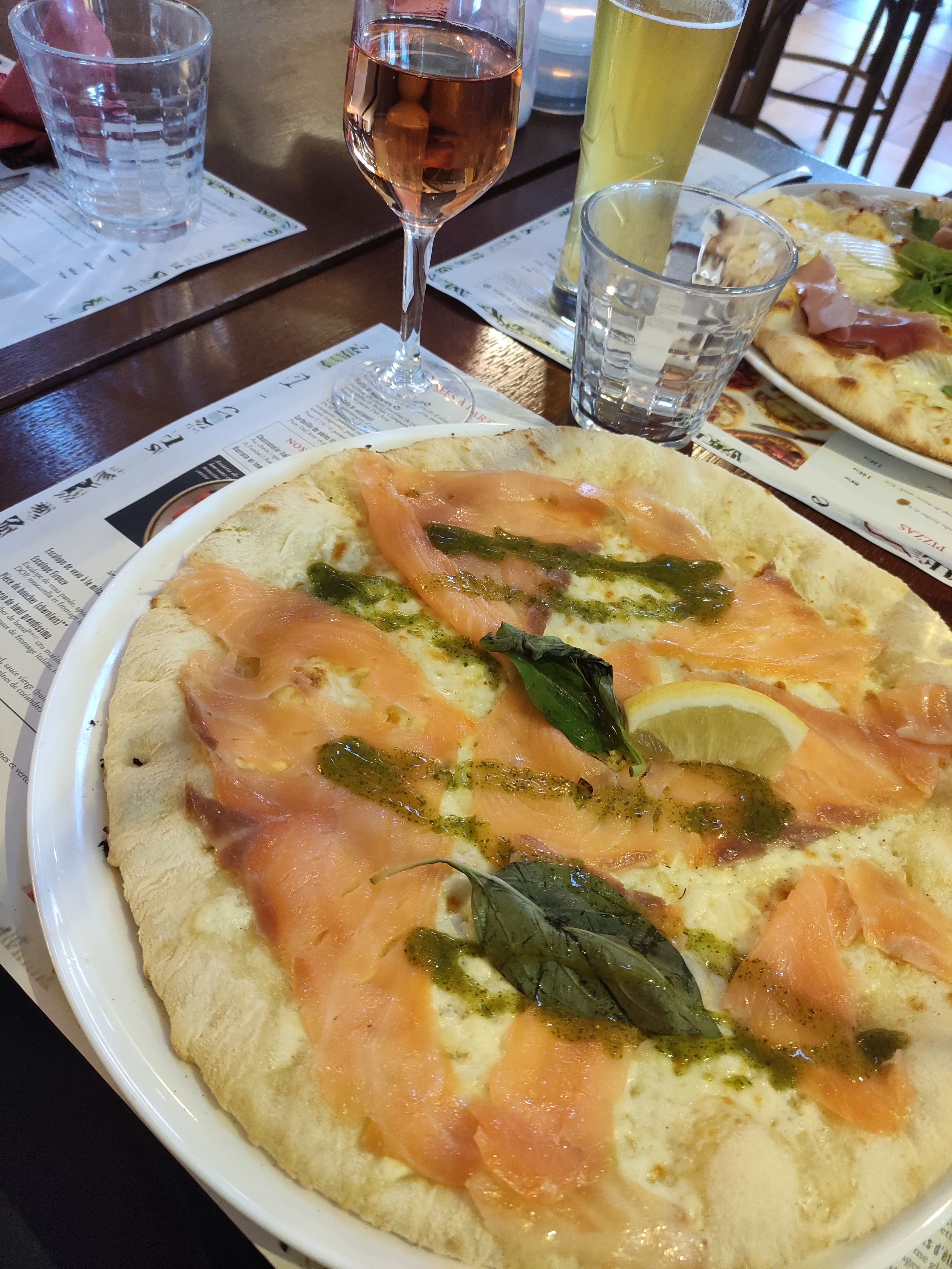 Nous n'avons pas aimé. Nos pizzas étaient trop peu garni pour le prix à payer. Compter environ 13 € pour une pizza recouvert de 2 bout de jambon qui se battent en duel ( pas de petit accompagnement salade avec la pizza ce n'est pas les 3 bouts de roquette sur la pizza ou 2 feuilles de basilic qui font la différence) 3,50€ pour des verres de vins remplis à moitié, même pas a température. L'assiette de ma fille était partit sans même qu'elle est eu le temps de la finir et surtout sans que l'on nous demande... Un autre gros point négatif je me suis fait bousculée par les serveurs à plusieurs reprises sans qu'ils s'excusent (je me suis pourtant avancé au plus près de ma table et mêmes déplacer un peu ma table mais rien n'y faisait et je ne fais qu'un 40 de taille 😁...) Mise a part a l'entrée pas un bonjour ou un sourire des serveurs... Le menu enfant est correct il est à 6,50 € avec le plat, une boisson, un dessert et ils ont des crayons et une feuille de coloriage. Je n'ai pas trop attendu mon plat PS: ce n'est pas du saumon cuit sur la pizza et si vous ne demandez pas votre pain vous n'en n'avez pas même si vous avez un plat en sauce... Ps2: oui je sais, je peux appeler le responsable bla bla bla pas la peine de répondre avec vos messages déjà tout fait, votre restaurant reste néanmoins très jolie et propre. Bien à vous. Sabrina.