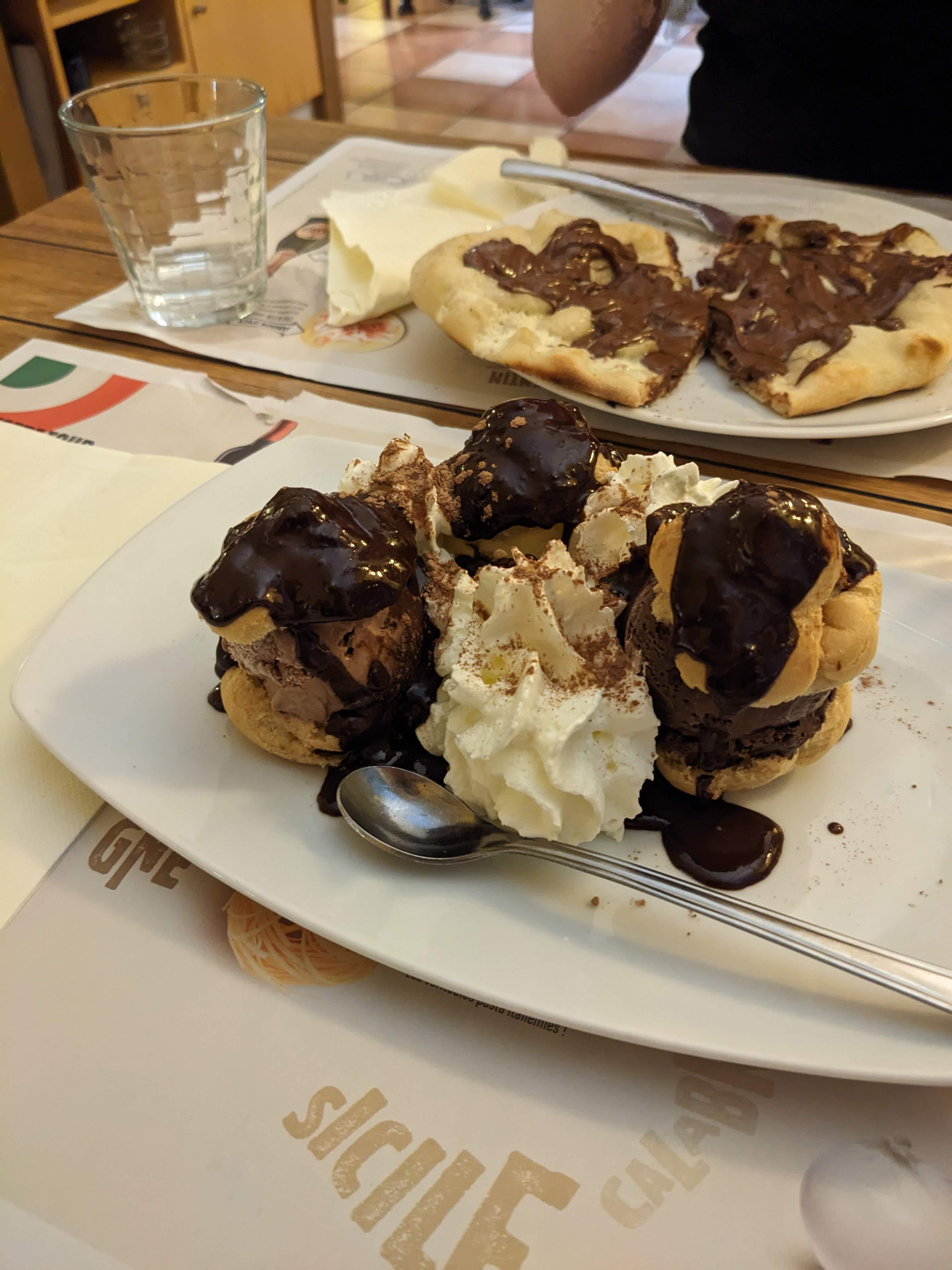 Nous sommes allés le Mardi soir à 20h30. Le restaurant était très calme et l'atmosphère italienne se sent. Les plats sont arrivés plus rapidement et ça, c'était cool. On a commandé plusieurs plats de pâtes qui étaient toute délicieuses, les pâtes au saumon pourraient avoir plus de goût à l'intérieur car le goût du saumon disparaît un peu. La pizza était bonne aussi. Et les profiteroles riches en goût. Le serveur était patient avec nous et a fait l'effort de parler anglais avec mes compagnons américains. Dans les photos : Pâtes saumon / Gnocchi gorgonzola / Pâtes plusieurs viandes / Pizza margherita avec supplément salame piccante et champignons / Profiteroles Gourmandes.