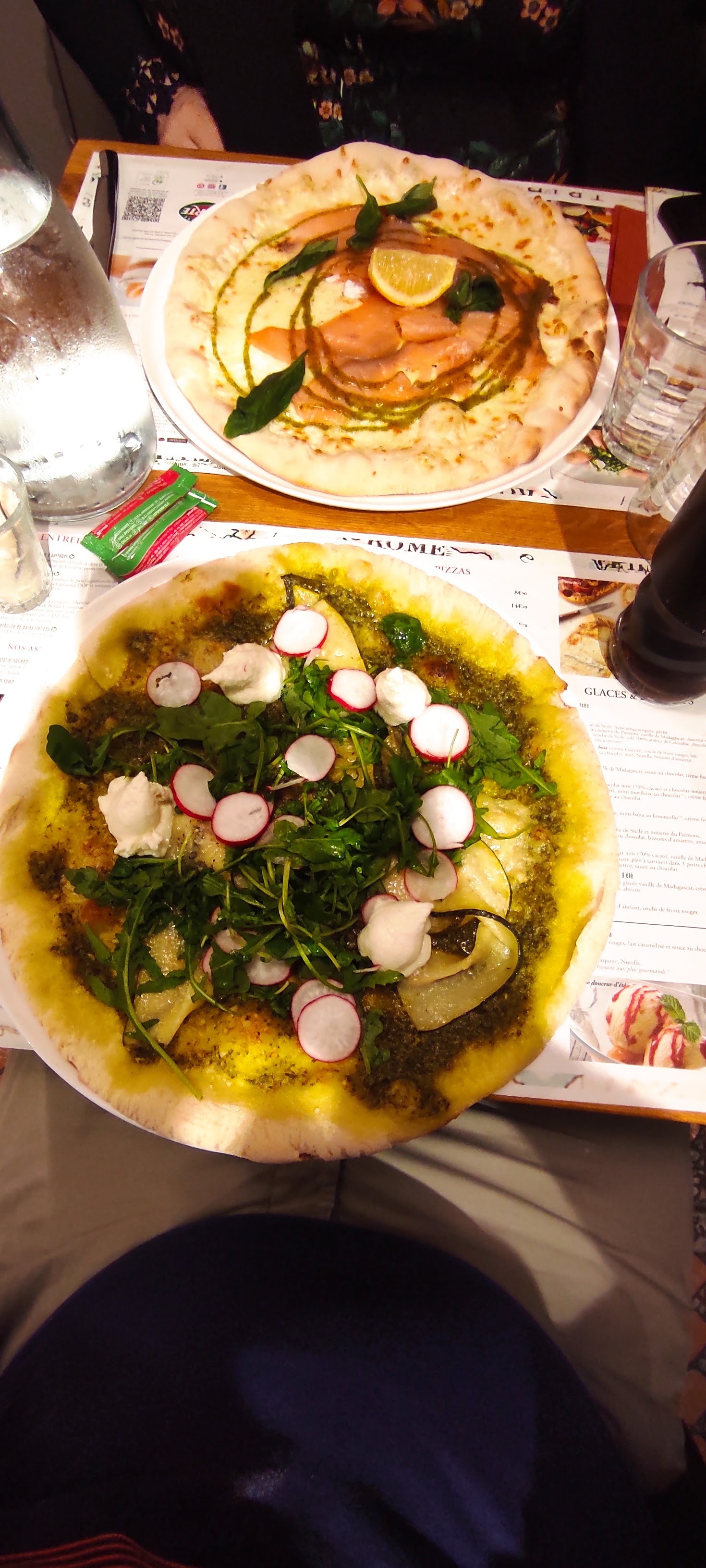 Très bonne expérience. Personnel très poli et professionnel. Nous avons mon mari et moi pris une pizza chèvre /miel sans voir qu il y aurai du jambon. A l arrivé la serveuse nous les a changé très gentiment. Elle aura bien mérité son pourboire.