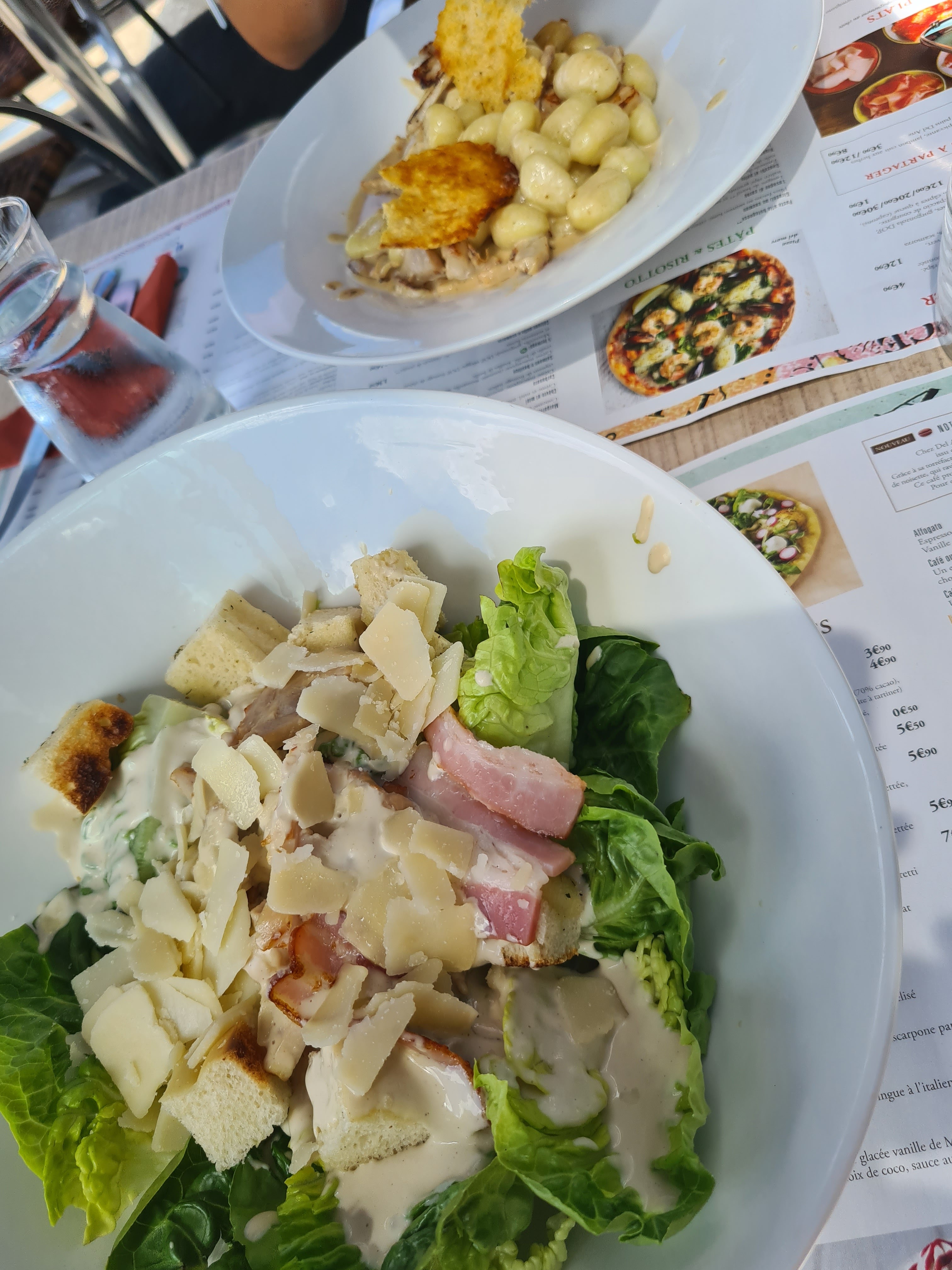 Dans la composition de la salade, il y avait de la pancetta, j'ai eu du lard à la place, la salade verte, beaucoup de trognons, heureusement elle était bonne malgré tout, au moins ça 🤷♀️