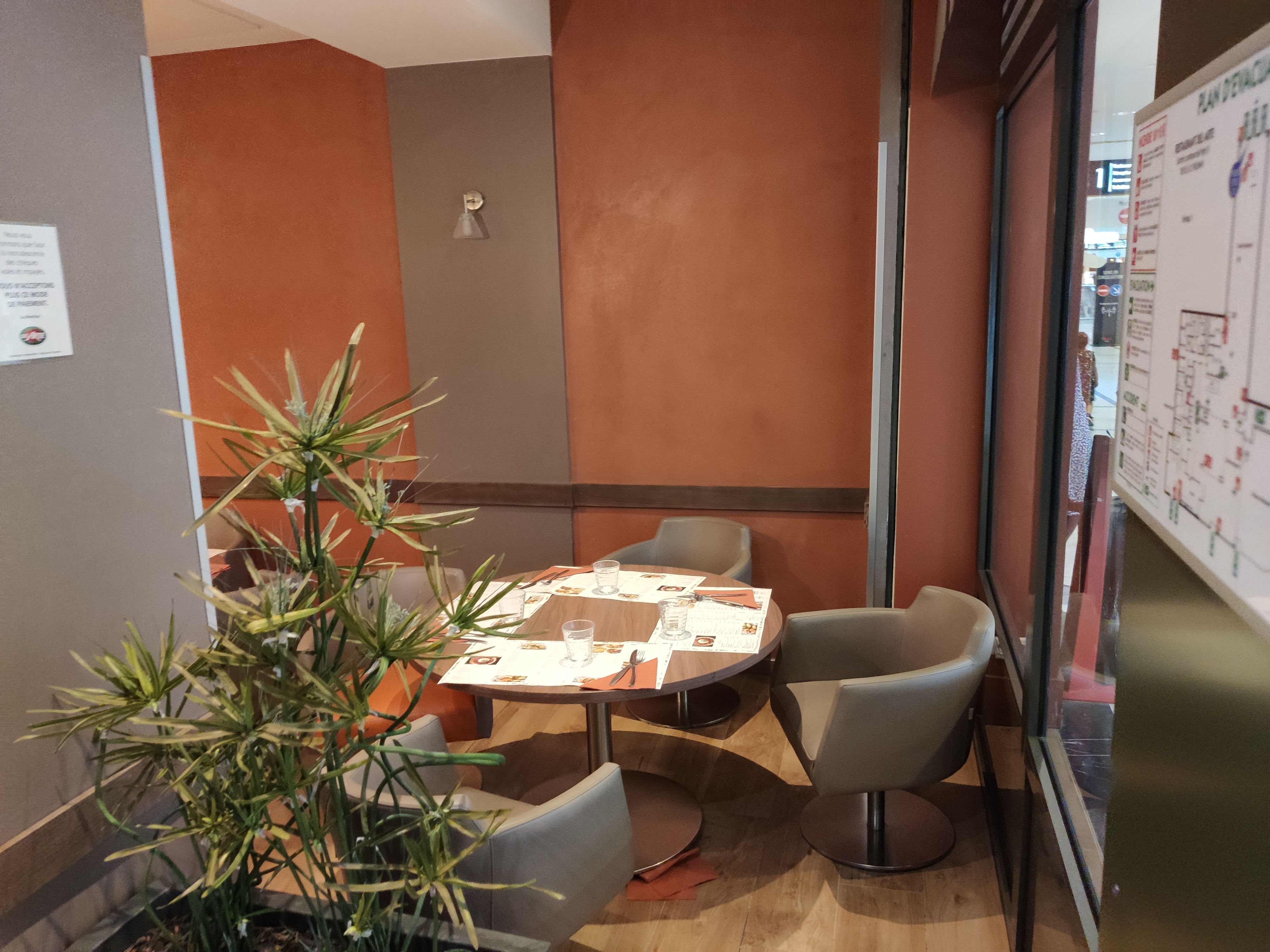 Accueil souriant. Salle immense avec différentes ambiances ( près des baies vitrées, de la cuisine et du bar ou plus côté du centre commercial). Service efficace. Menus à petit prix possibles le soir et le week-end ! Aubergines au parmesan top. Nous avons passé un moment agréable et ça fait du bien.