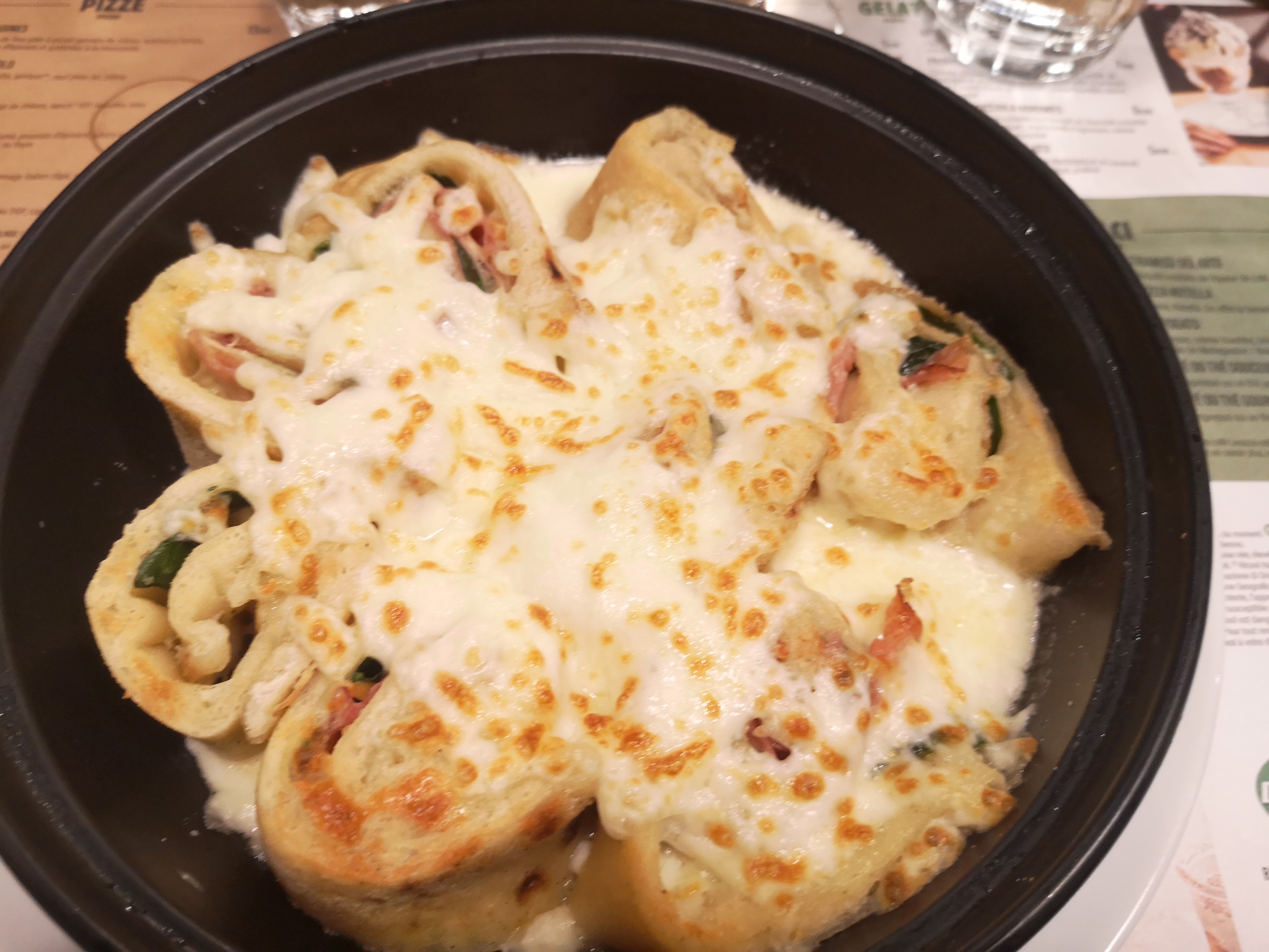 Gnocchis au poulet à peine chaud. Nous étions 4 les gnocchis pour 2 pers servis en premier nous avions pratiquement terminé quand les 2 cal zones ont été servi. Très déçue