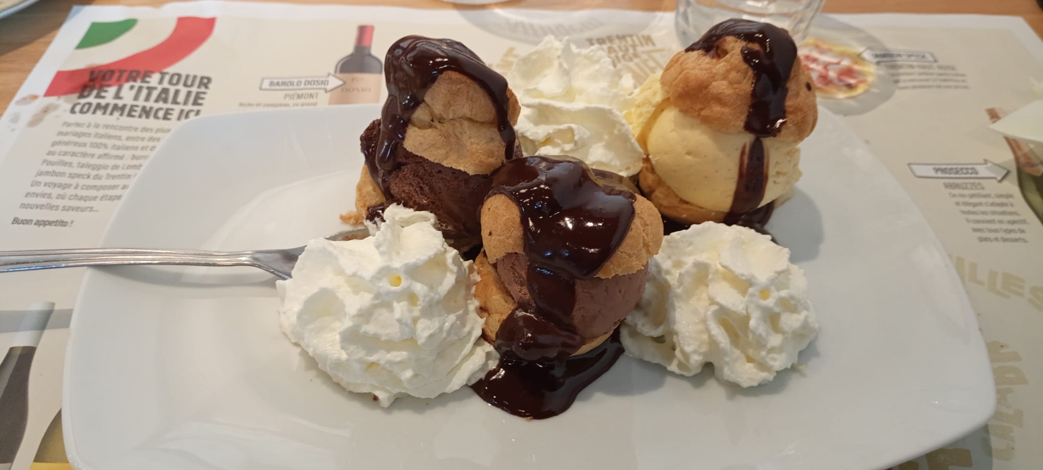 Cela faisait longtemps que je n'avais pas mangé une pizza Fruits de mer comme ça !! C'est très rare... De vrais coquillages. Très bonne. Pizzeta jambon/champignons servie avec salade. Serveuses au top et aimables. Profiteroles bien garnies!