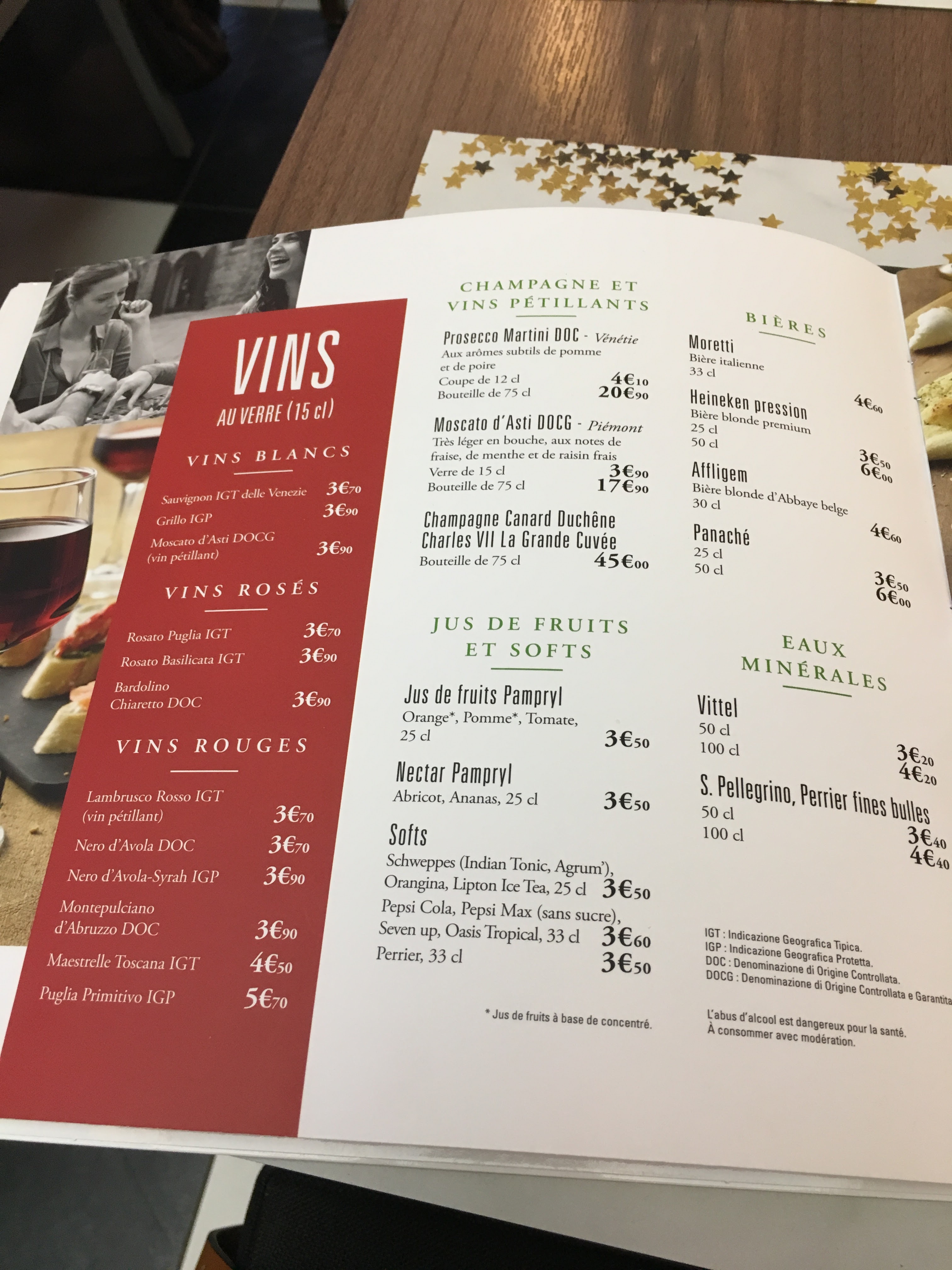 Pas de menu présenté sur les sets de table qui font office de carte. Les serveurs ne nous ont pas parler de ces menus et nous nous sommes retrouver à payer 12€ un plat qui ne comprennait qu'une demi pizza et une pauvre salade vinaigrette. Les prix des plats sont exorbitants, 17€ pour un plat de pâte. Déçus de cette expérience, nous ne reviendrons plus.