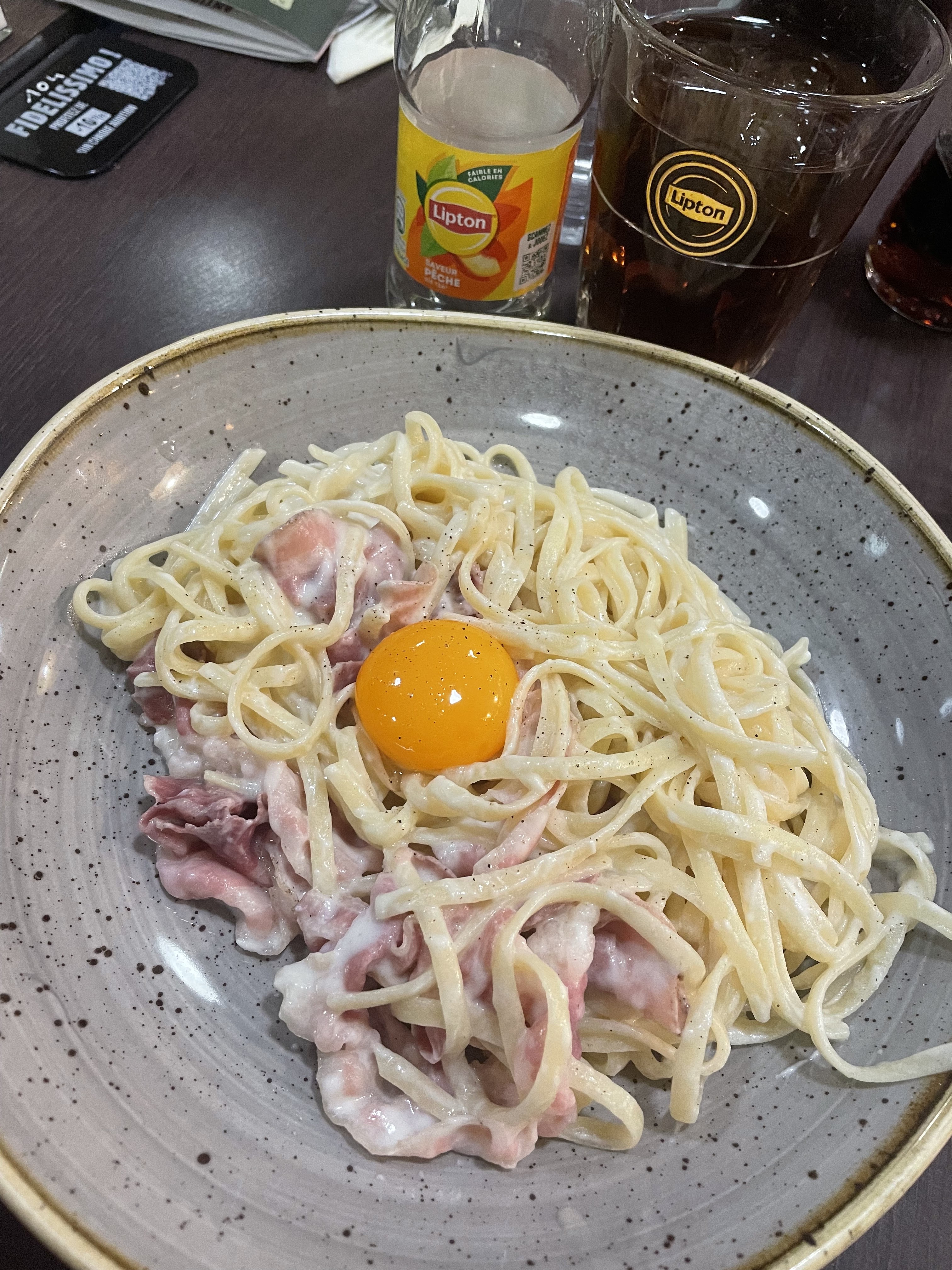 Les pâtes carbonara, c'est très simple à faire mais ici, ça baigne, c'est fade.. Par contre les antipastis, et les pâtes pesto c'est super. Les serveurs pourraient être plus heureux de nous recevoir, et faire en sorte que le pain italien arrive en même temps que les plats serait sympa, et souvent quand le pain arrive il est froid. Vous faisiez bien mieux avant.