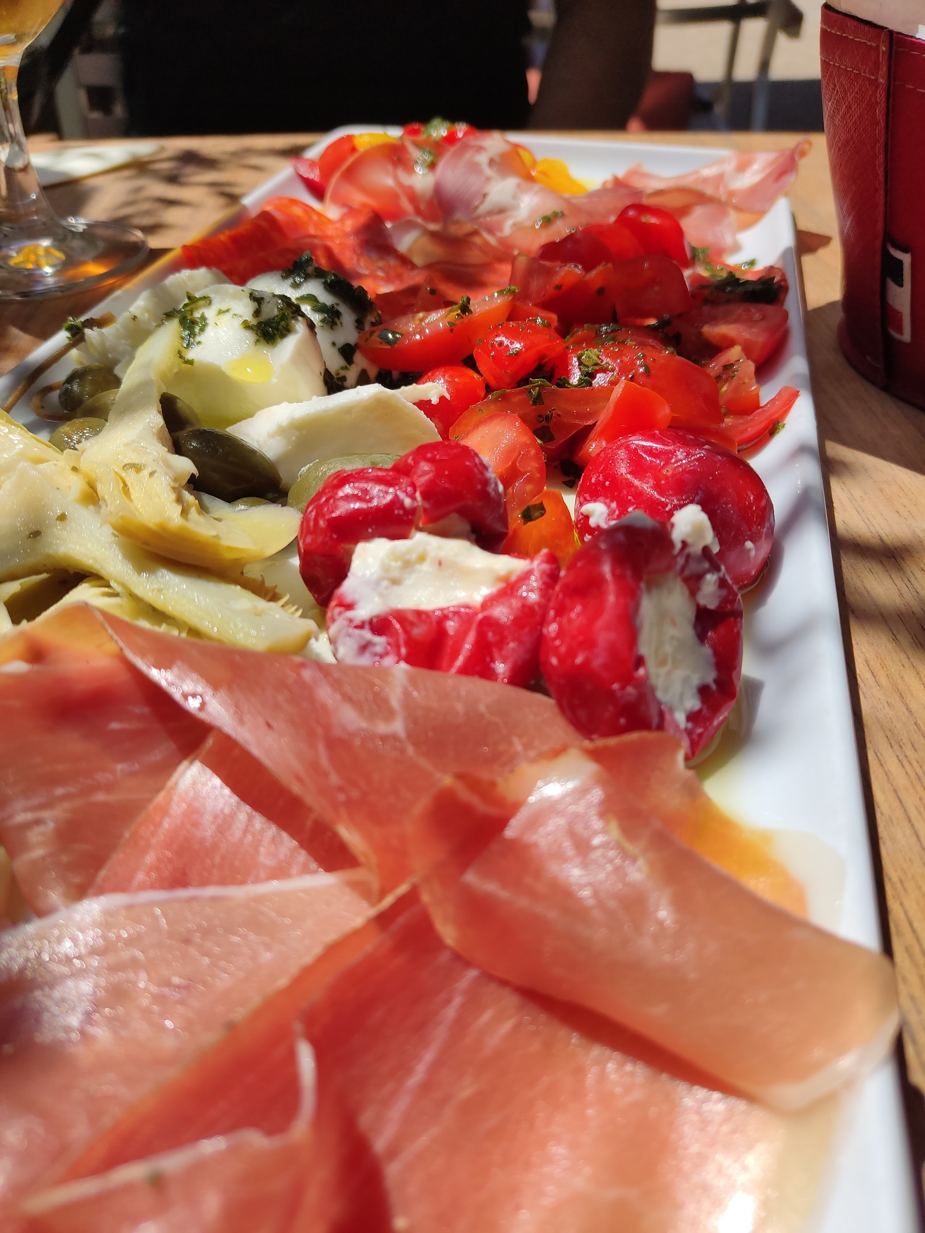 Très bonne planche apéritive, petit appétit donc petite pizza accompagnée de salade et bon petit dessert à base de café et glace, l'affogato.