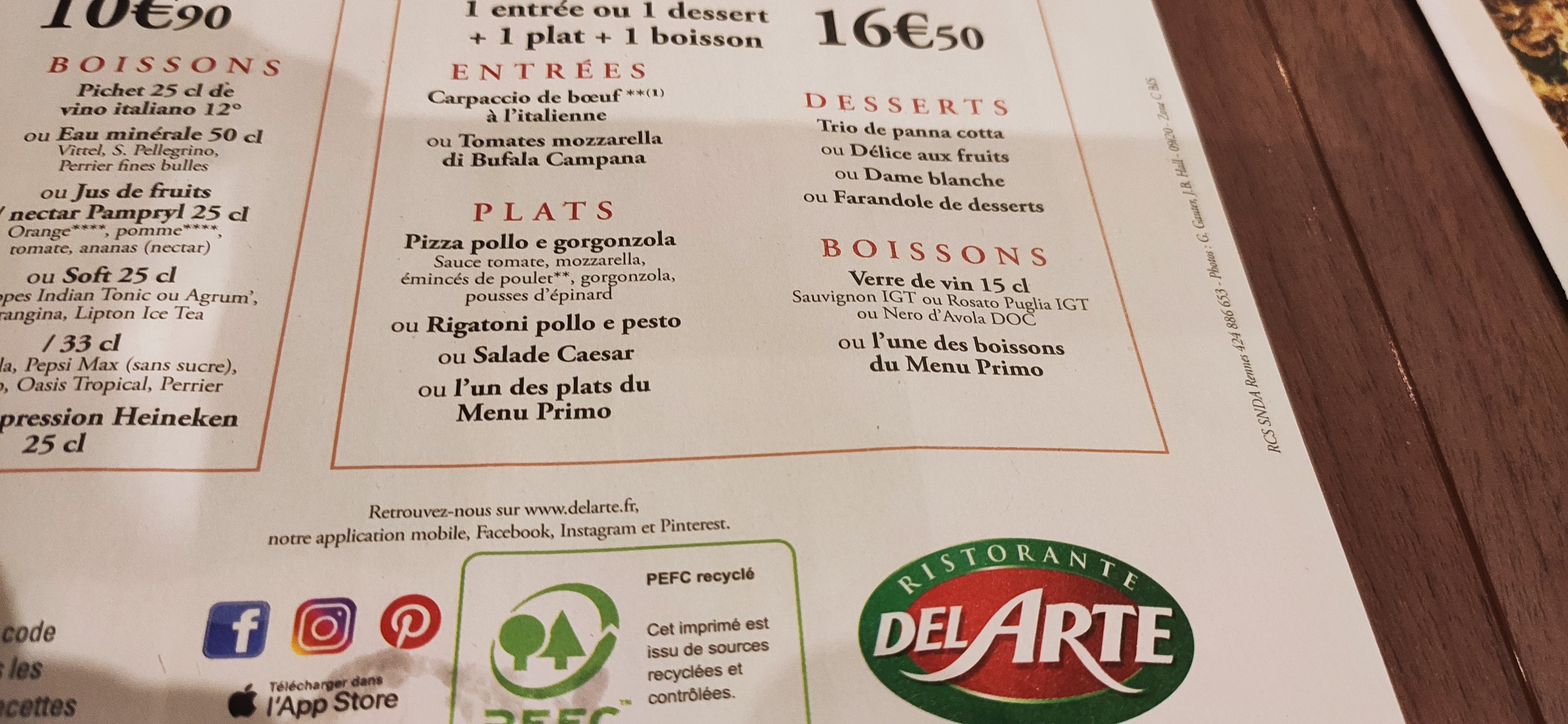 Hier soir nous avons dîné à Del Arte. Les serveurs étaient accueillants, attentifs et réactifs. Le restaurant permet d’accueillir des grandes tablées et propose « des doggys bags « J’ai commandé des pâtes poulet pesto et duo de panna cotta. Concernant les pâtes : C’était bof d’un point de vue goût et présentation ! Des morceaux de filets de poulet auraient été bienvenus, le pesto devrait être un peu plus relevé. Pour la panna cotta : le coulis était hyper acide Au regard de la conjoncture actuelle, les tarifs sont très corrects. « On mange pour le prix proposé »