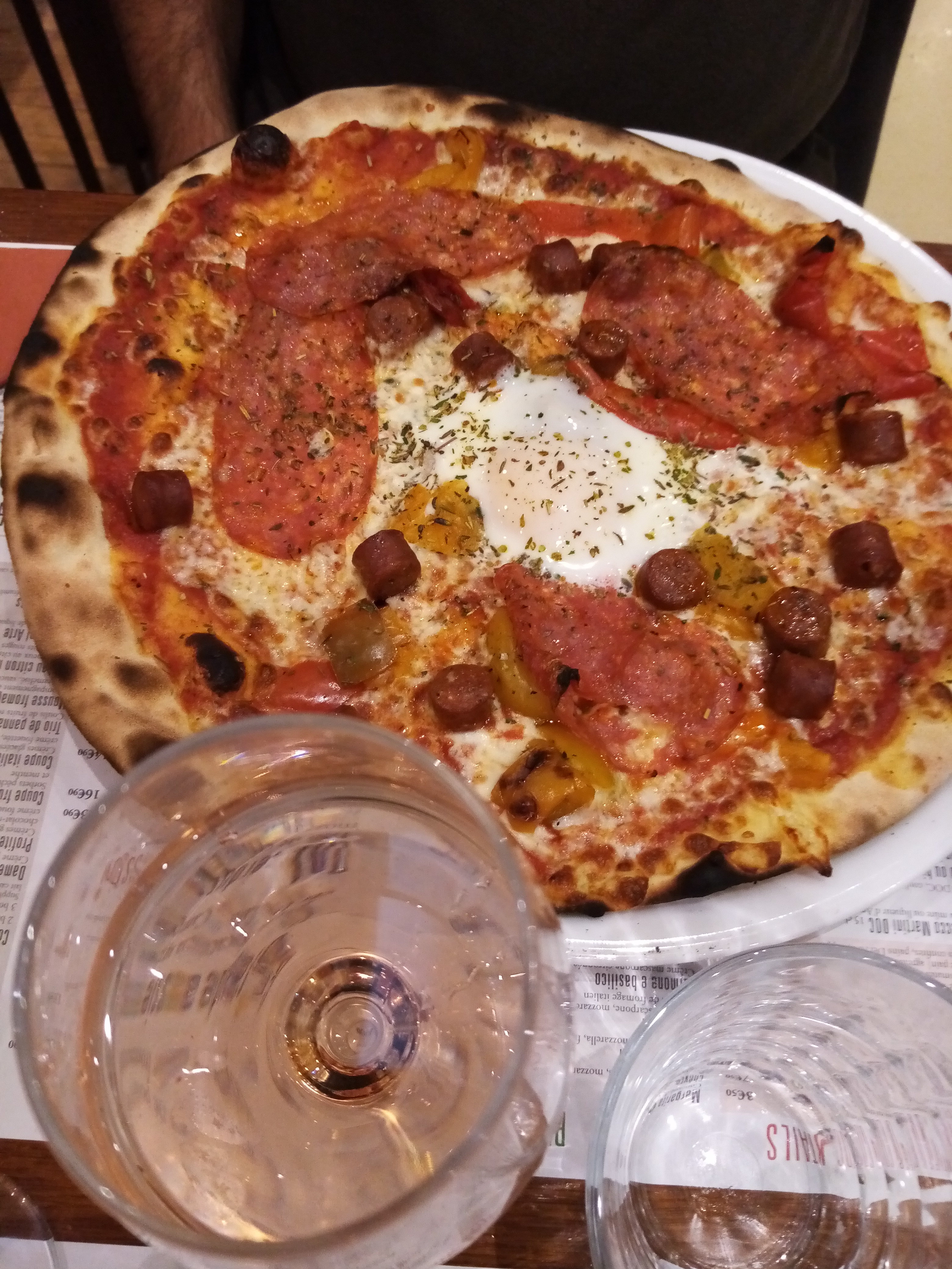 La pizza ressemblait à un désert nous avons cherché les tranches de saucisses et il n'y avait que la pâte avec une légère couche de tomates 4 petits tas (grosseur d'une bille) qui semblait être de la viande 4 cuillères à café de mozzarella et 3 tranches de poivrons pour 15€ ils n'ont pas honte