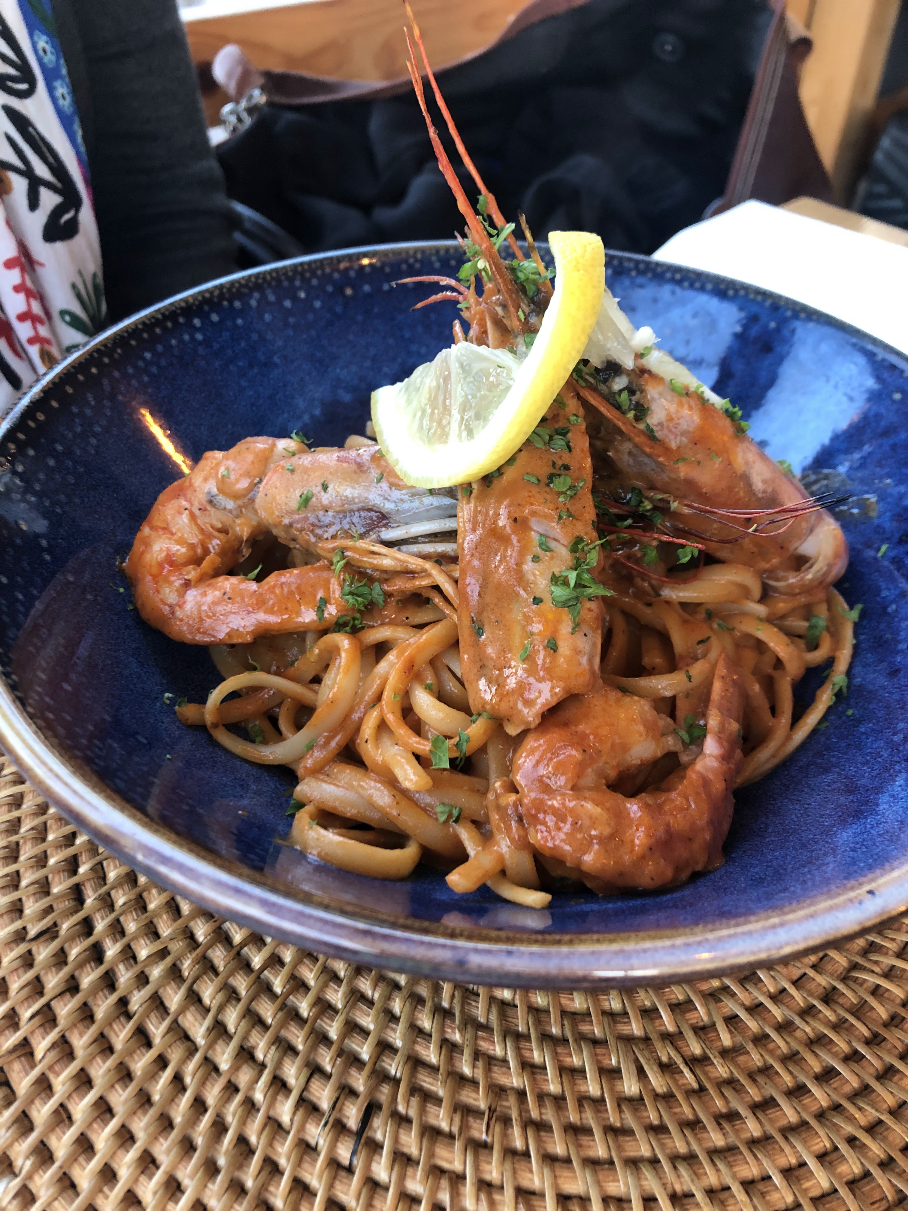 Linguine aux gambas délicieuses, jolie vue sur le port et une belle décoration ! Le personnel est serviable et très sympathique. Le burger au poulet top aussi