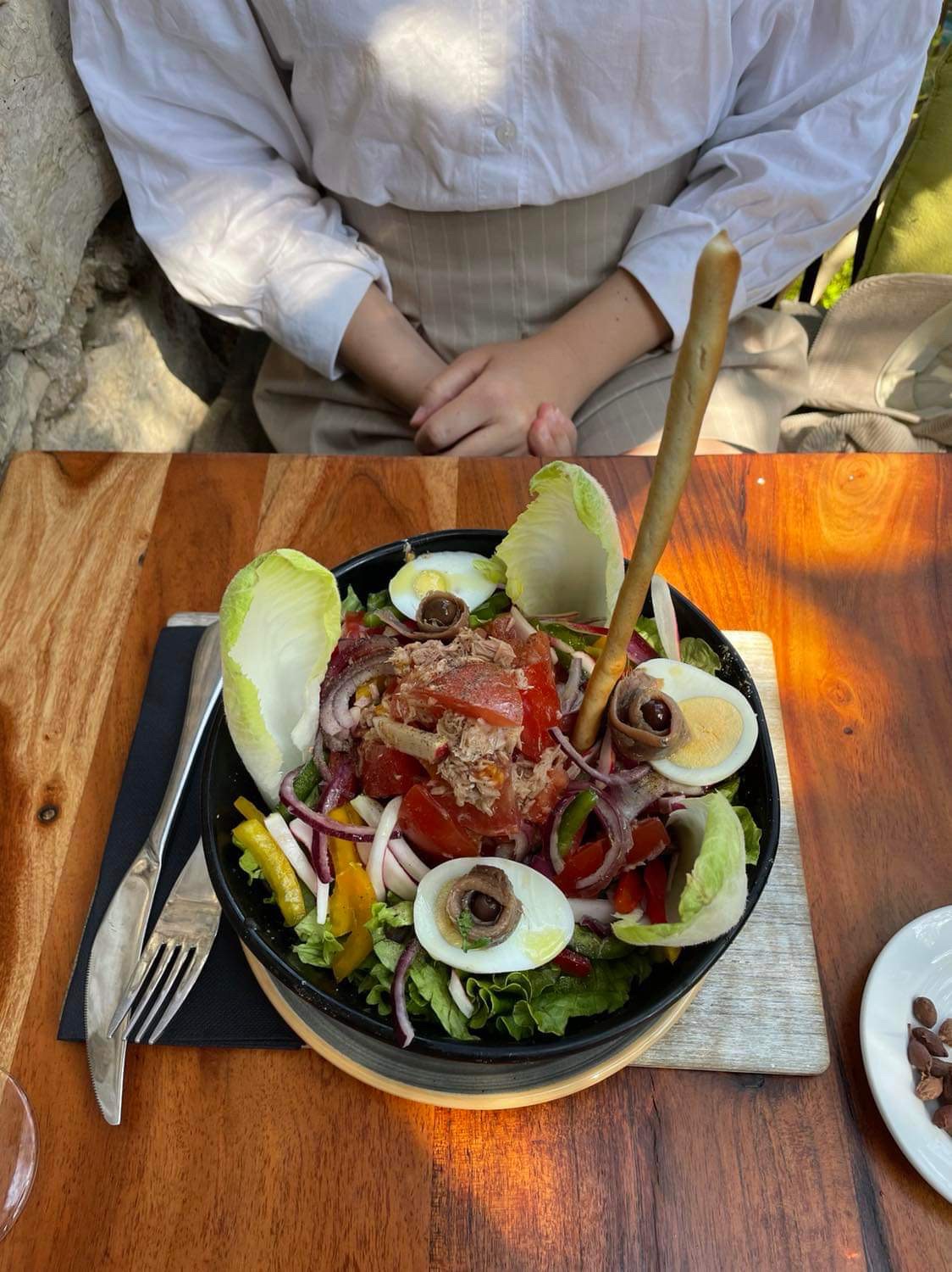 Beaucoup de monde à Eze-village aujourd’hui pour le dernier jour d’avril. Il ne restait plus que ce ravissant petit restaurant perché sur les hauteurs d’Eze-Village pour pouvoir déjeuner sans trop attendre. Heureusement car la salade niçoise (19€) était copieuse et bien bonne. Et le serveur, super sympa et souriant.